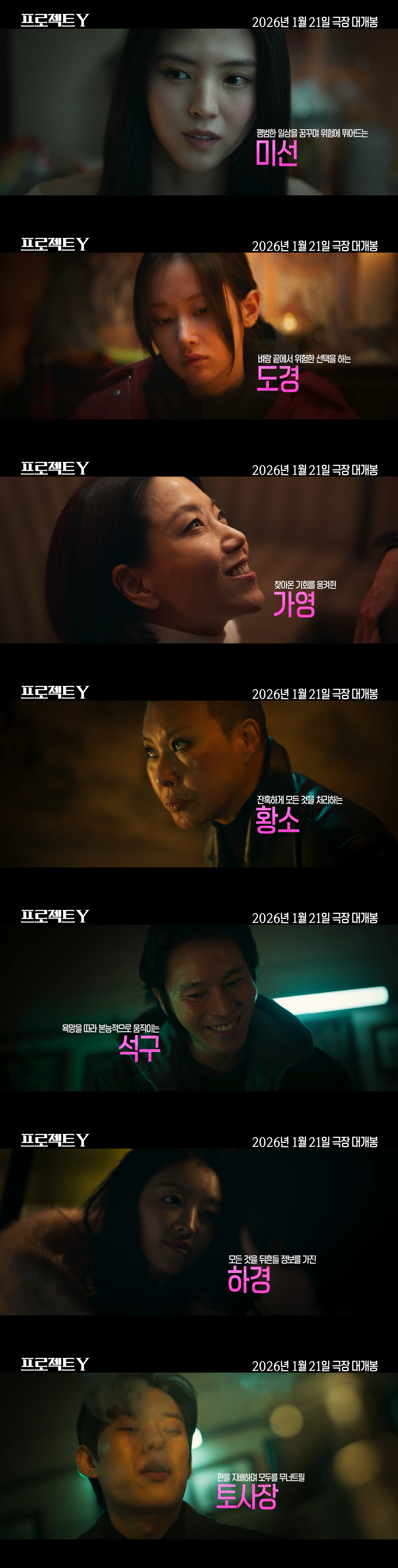 플러스엠 엔터테인먼트는 29일 영화 '프로젝트 Y'(감독 이환) 캐릭터 영상을 공개했다. 한소희, 전종서, 김신록, 정영주, 이재균, 유아, 김성철이 포착됐다.