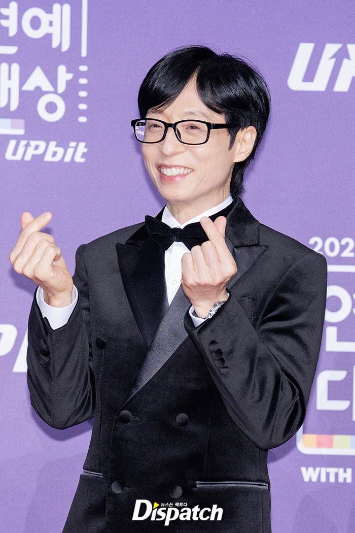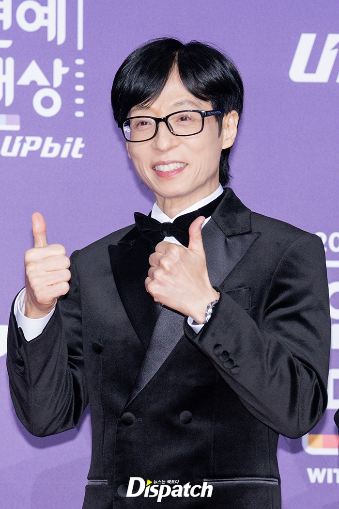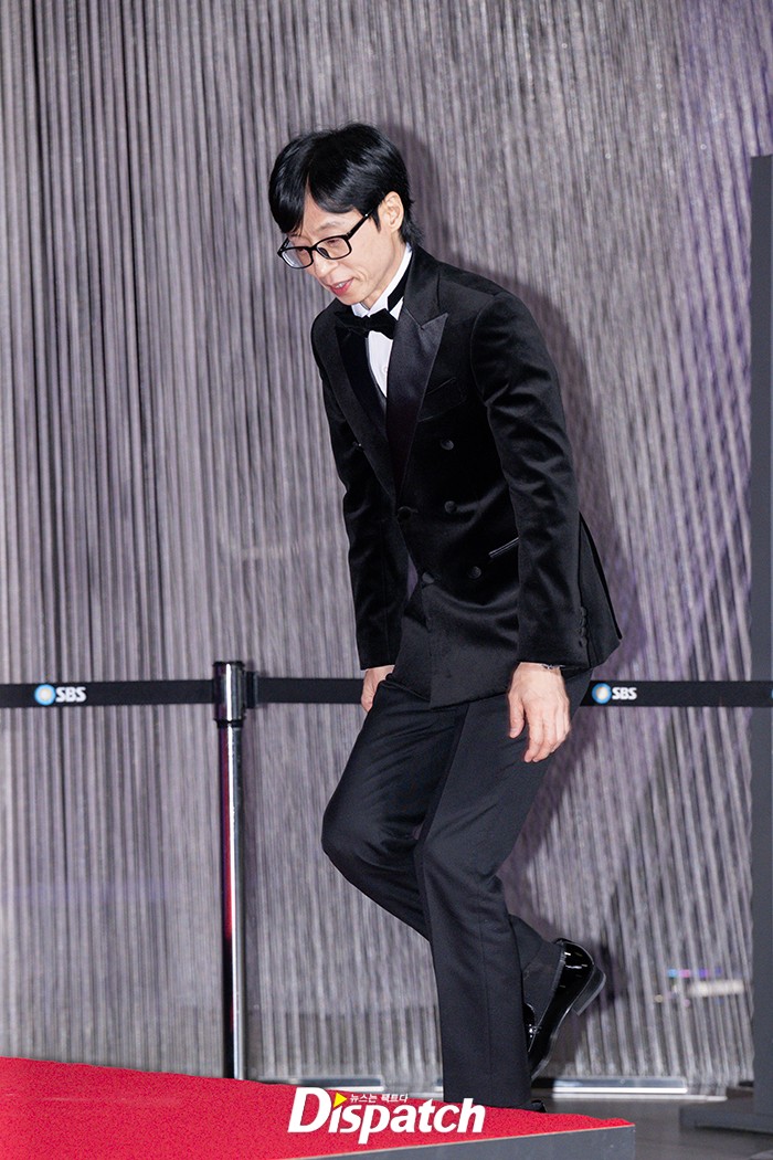 유재석은 블랙 벨벳 수트로 멋을 냈다.
