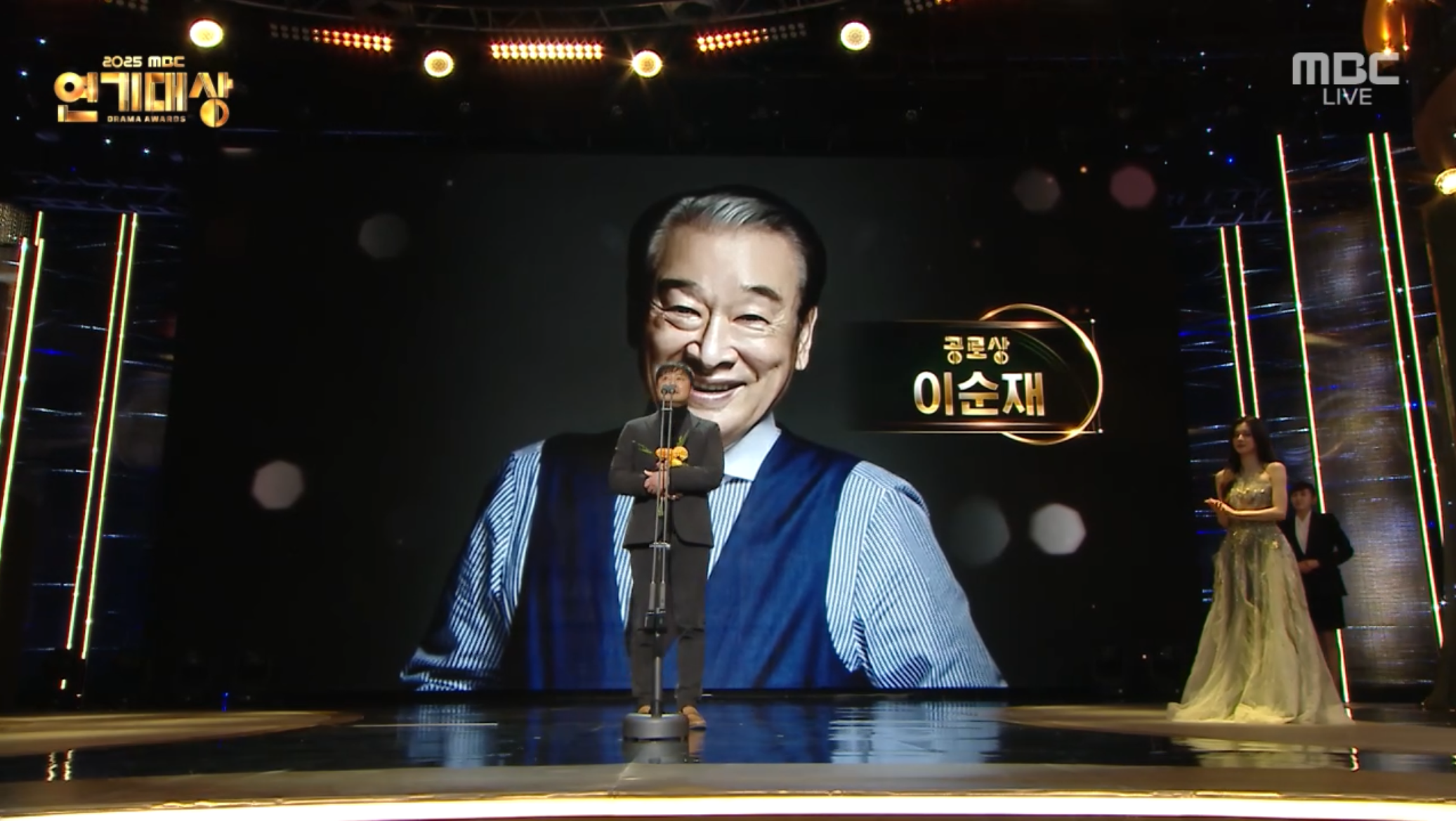 뜻깊은 시상도 이어갔다. 故 이순재가 공로상을 수상했다. 시트콤 '거침없이 하이킥'에서 함께한 박해미가 내레이션으로 그의 연기 발자취를 전했다.