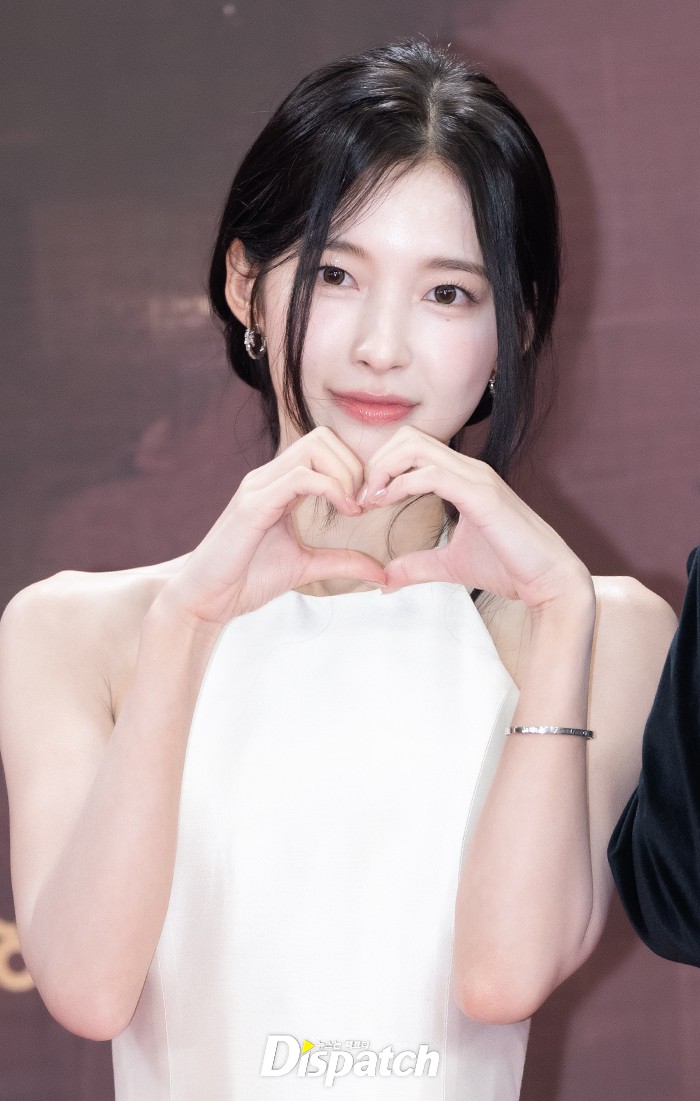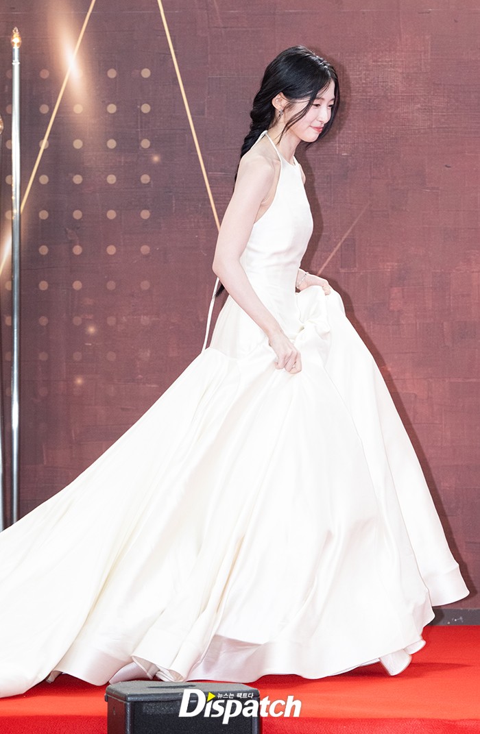 아린은 화이트 오프셜더 드레스로 아름다운 맵시를 뽐냈다. 순백의 미모가 돋보였다.