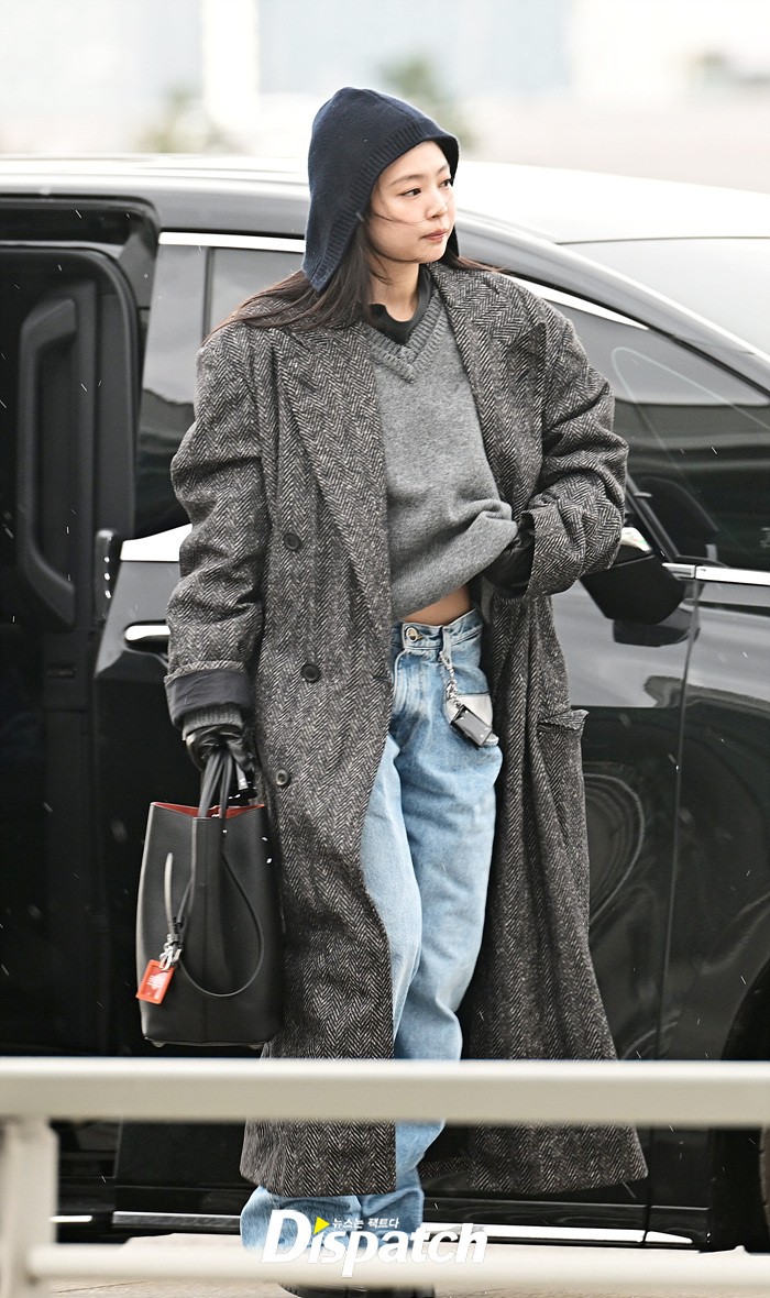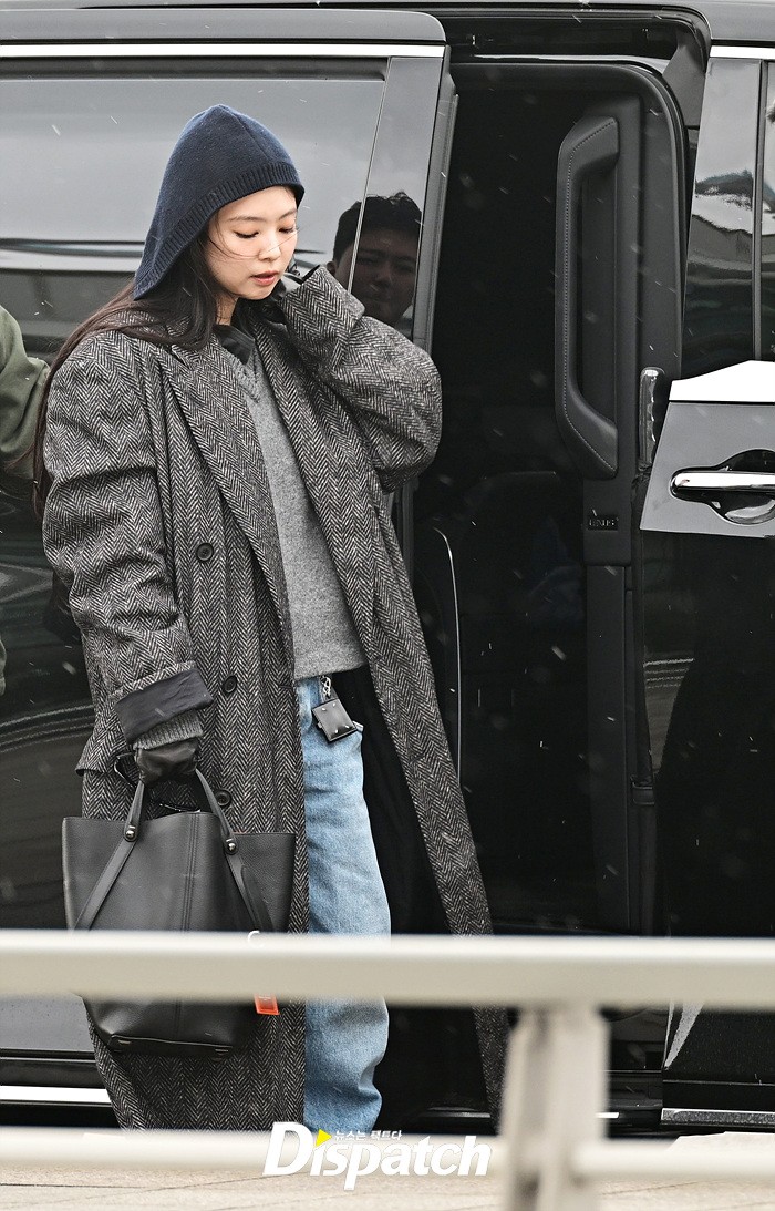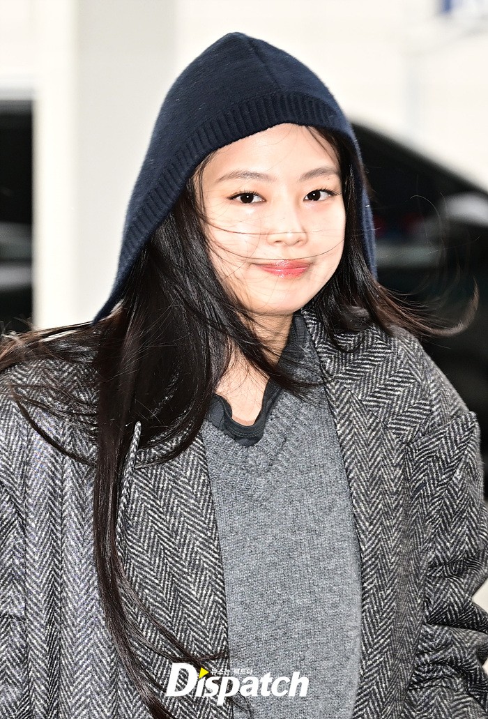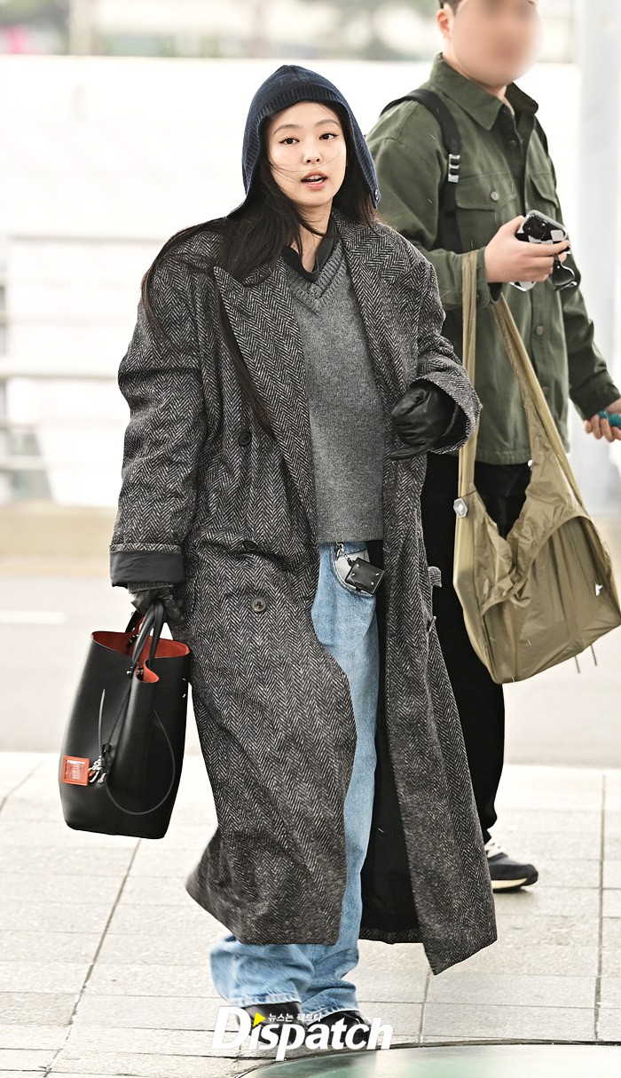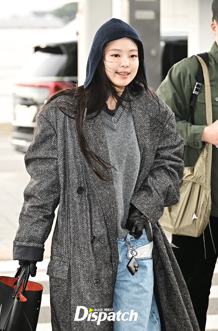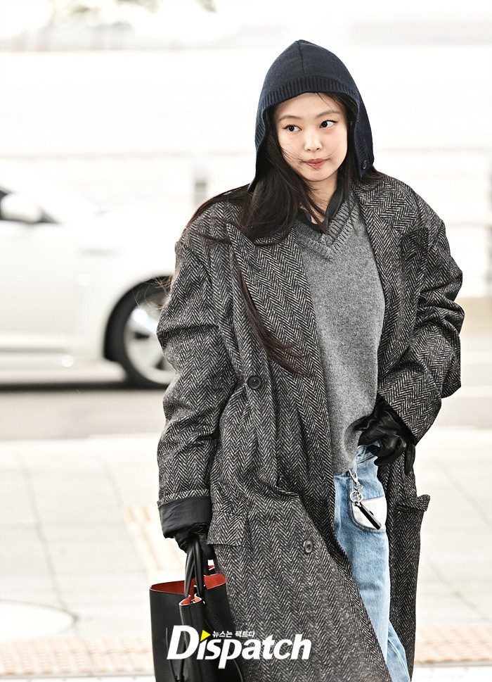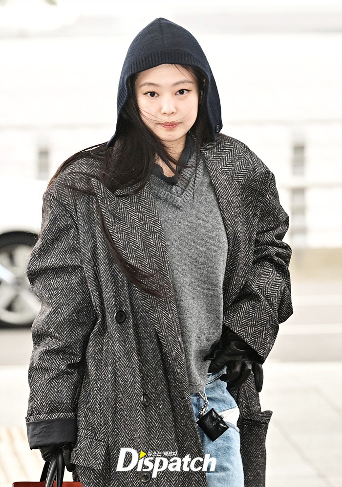 제니는 그레이 컬러의 롱코트와 데님 와이드진으로 남다른 패션감각을 뽐냈다. 후드로 연출한 센스있는 스타일링도 돋보였다.