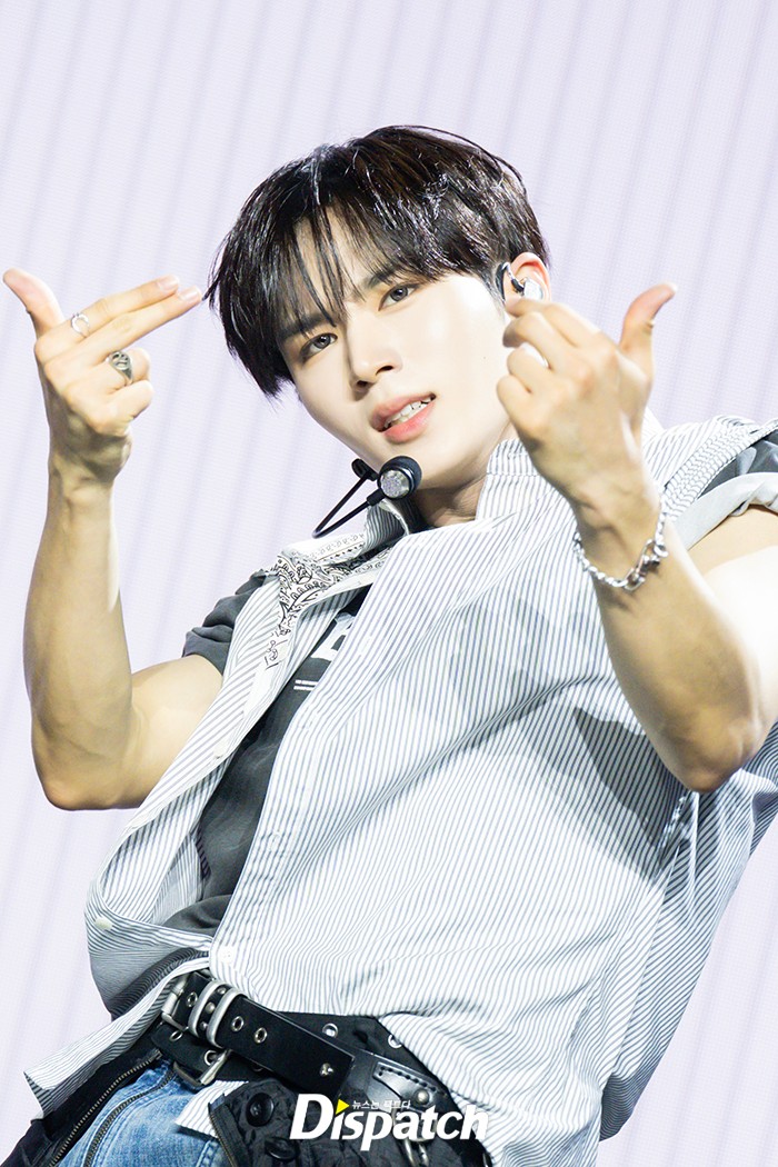 준서는 스트라이프 셔츠와 데님으로 멋을 냈다. 잘생긴 비주얼과 파워풀한 댄스가 시선을 사로잡았다.