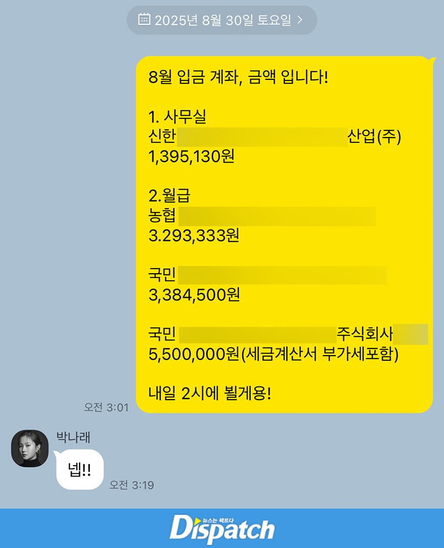 55. '디스패치'가 매니저 2명의 법카 내역을 1년치를 확인한 결과, 박나래 식사>간식>주유…순이었다.