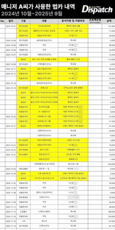 44. '디스패치'는 매니저 A씨의 1년치 법카 내역을 확인했다.