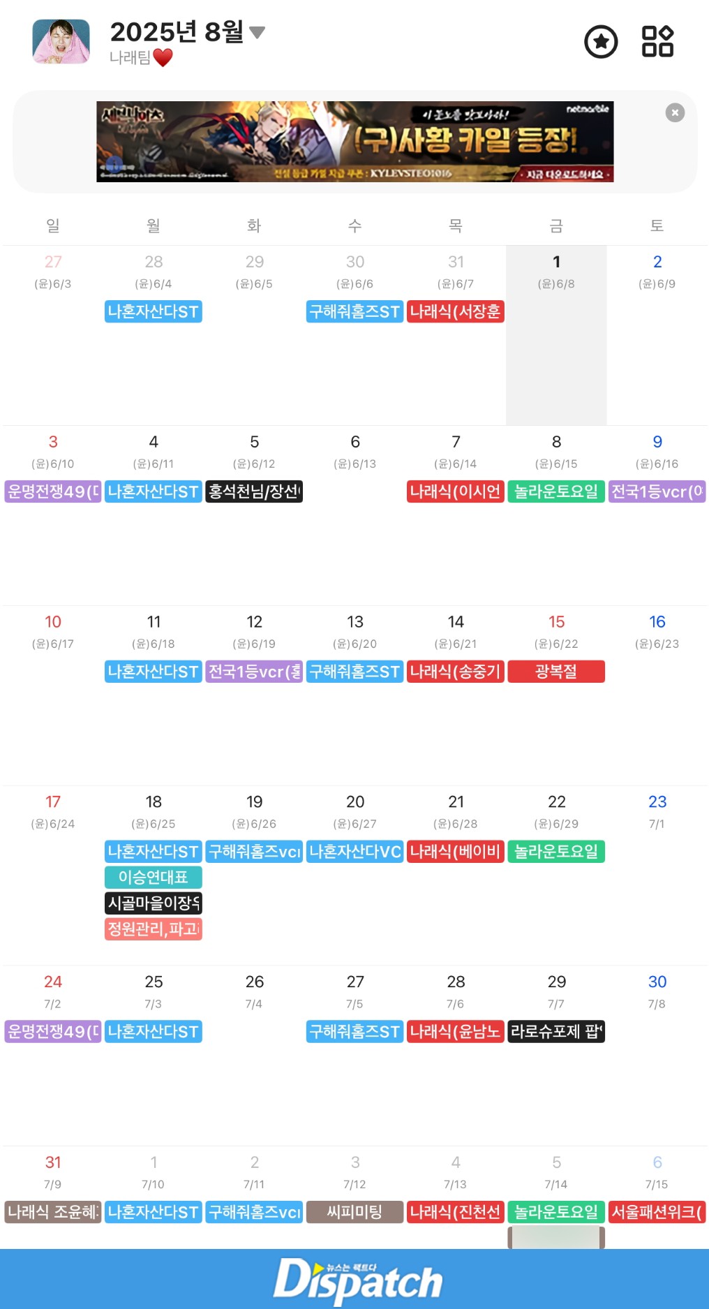 64. 다음은 박나래의 2025년 8월 일정표다.