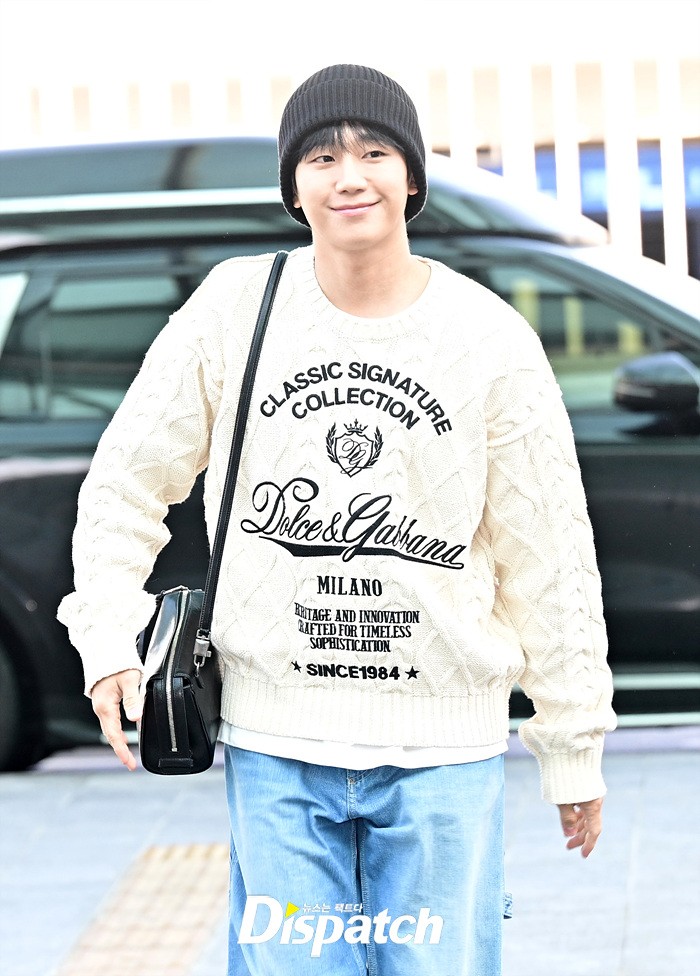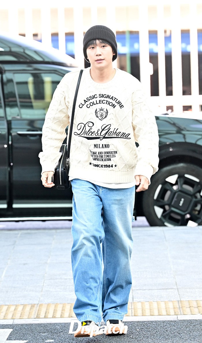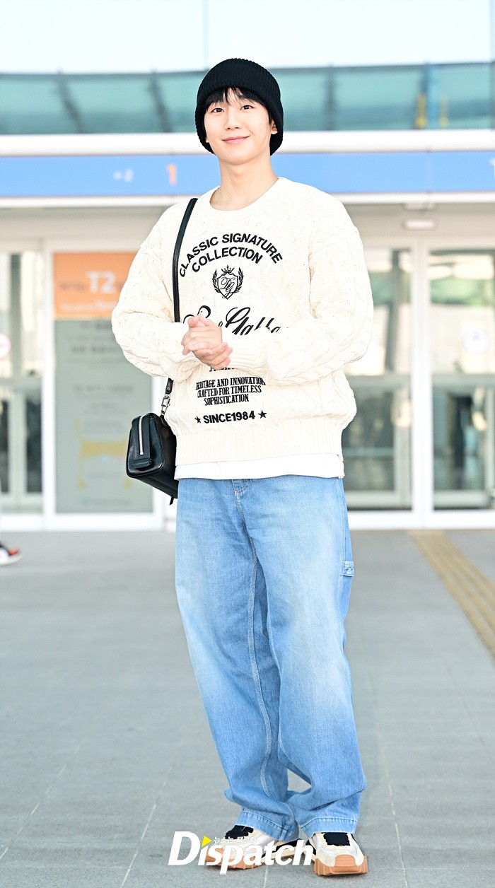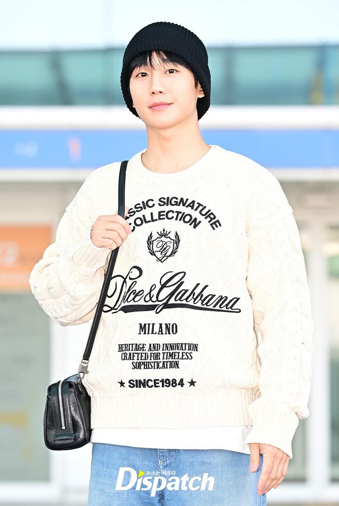 정해인은 아이보리 컬러의 니트와 데님진으로 캐주얼한 공항패션을 완성했다. 비니로 완성한 센스있는 스타일링도 돋보였다.