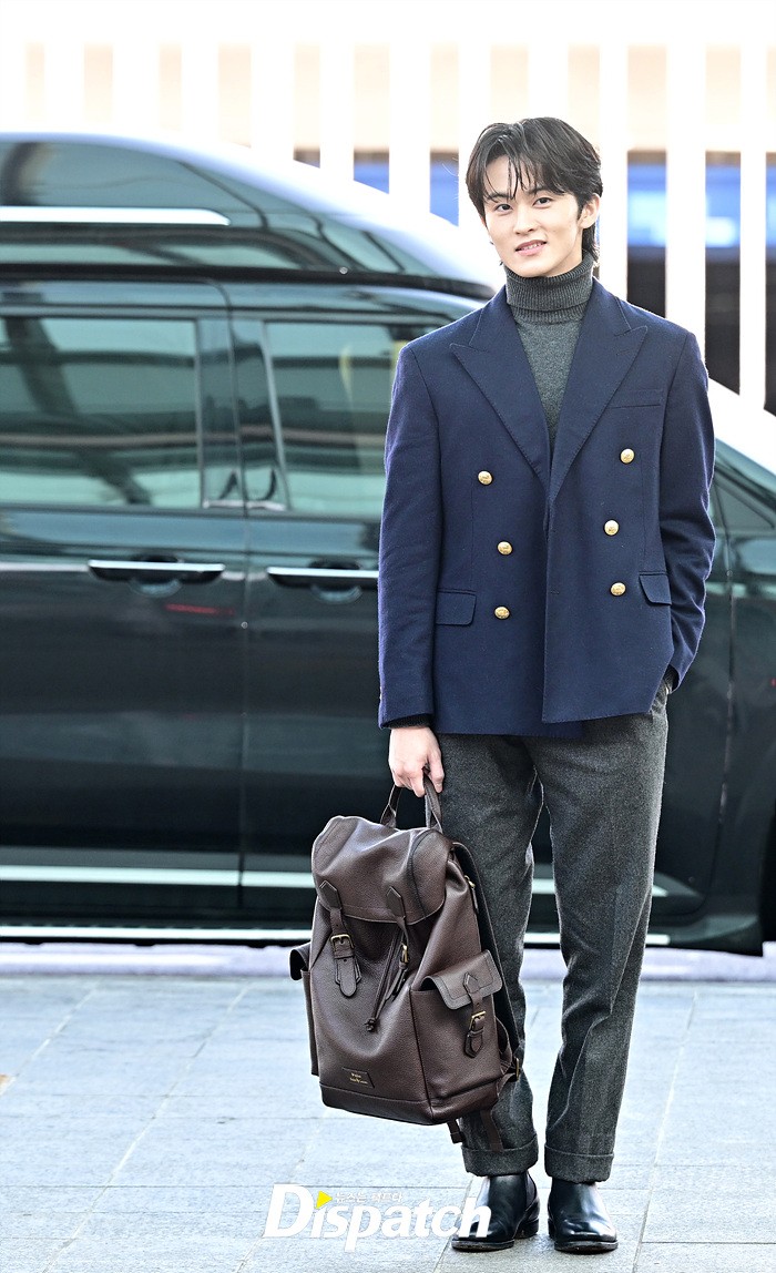 마크는 네이비 컬러의 재킷과 그레이 팬츠로 댄디한 이미지를 연출했다. 훈훈한 비주얼과 스윗한 미소도 돋보였다.