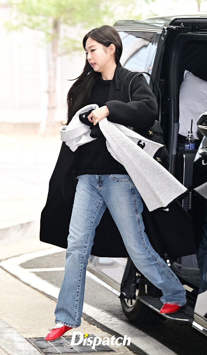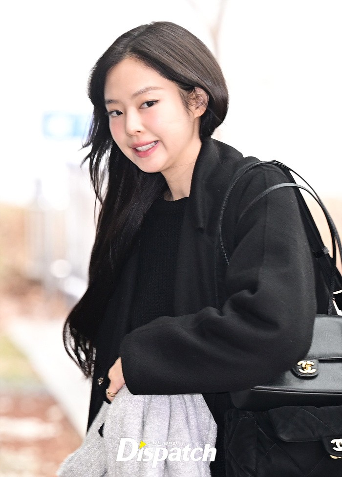 제니는 블랙 컬러의 코트와 데님진으로 심플한 공항패션을 완성했다. 러블리한 비주얼이 눈길을 끌었다.