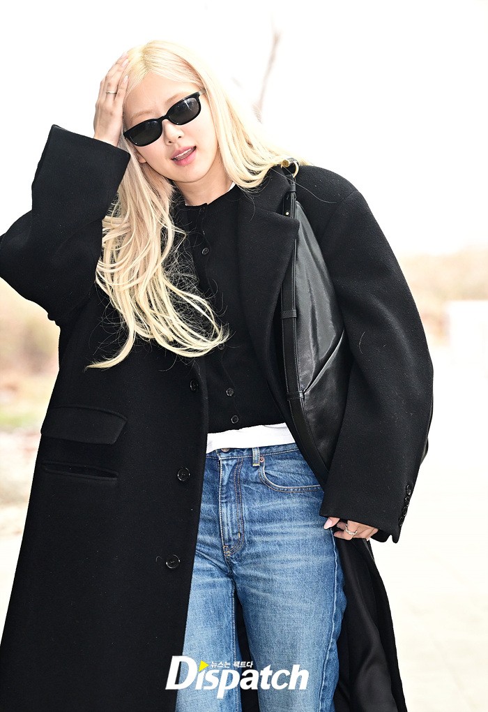 로제는 블랙 컬러의 코트와 데님진으로 심플한 공항패션을 연출했다. 청순한 비주얼과 러블리한 미소도 돋보였다.