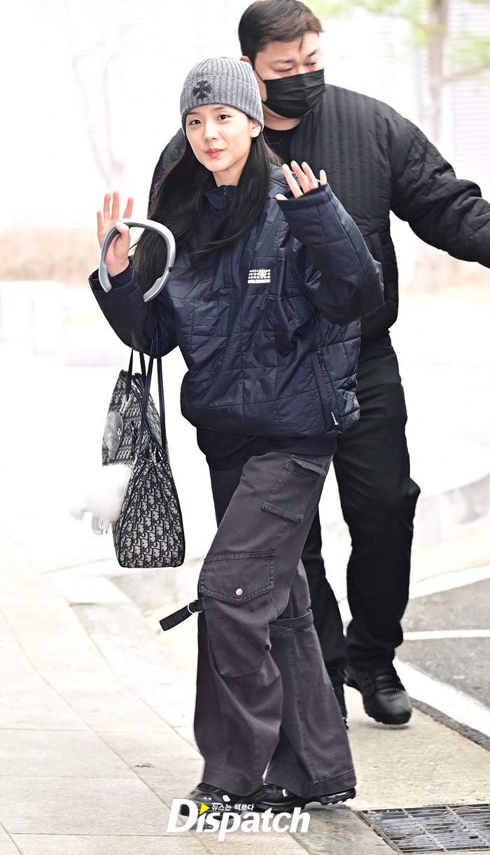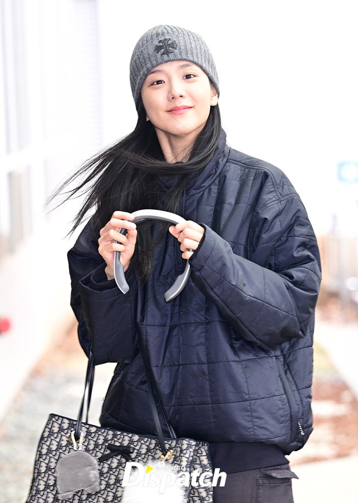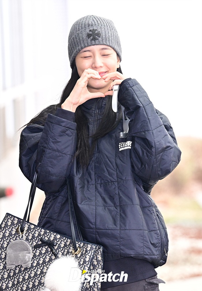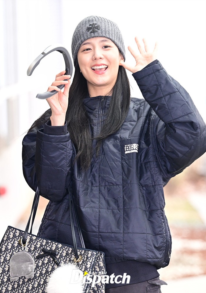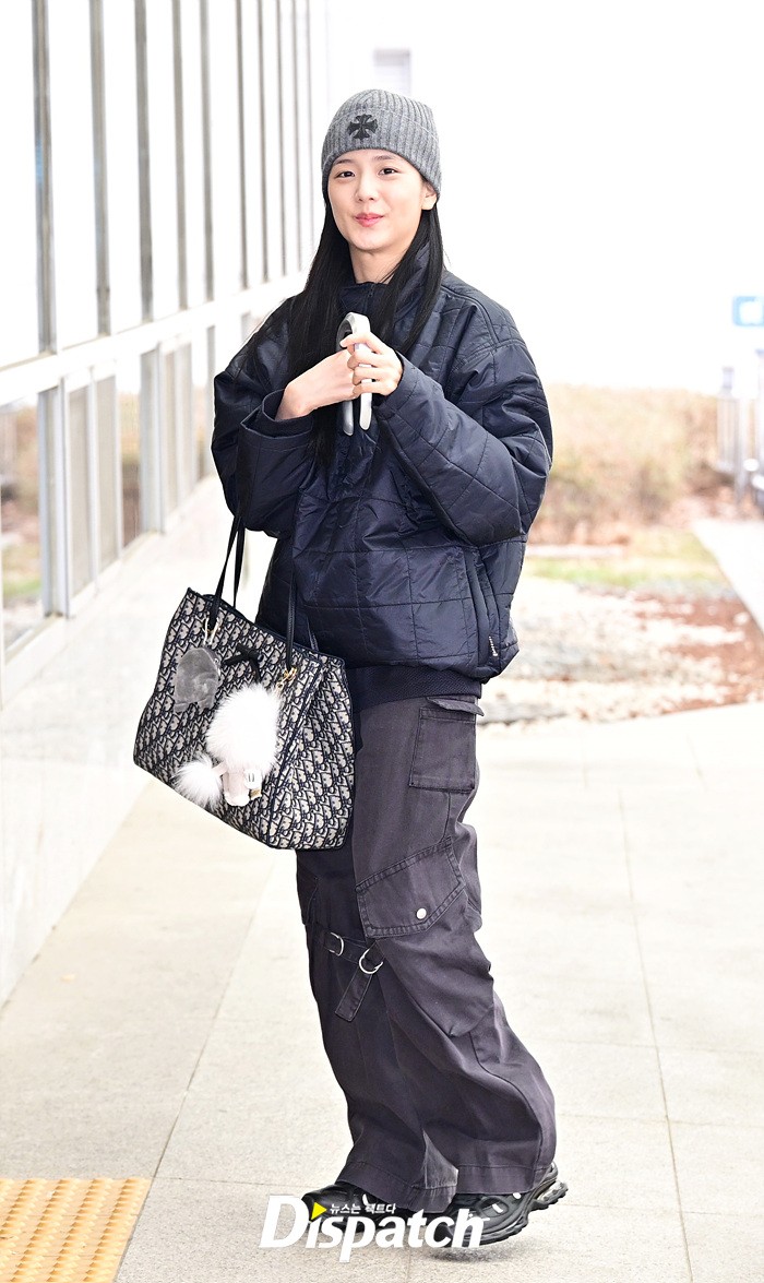지수는 네이비 컬러의 패딩과 카고팬츠로 캐주얼한 공항패션을 연출했다. 청순한 비주얼과 러블리한 미소도 돋보였다.