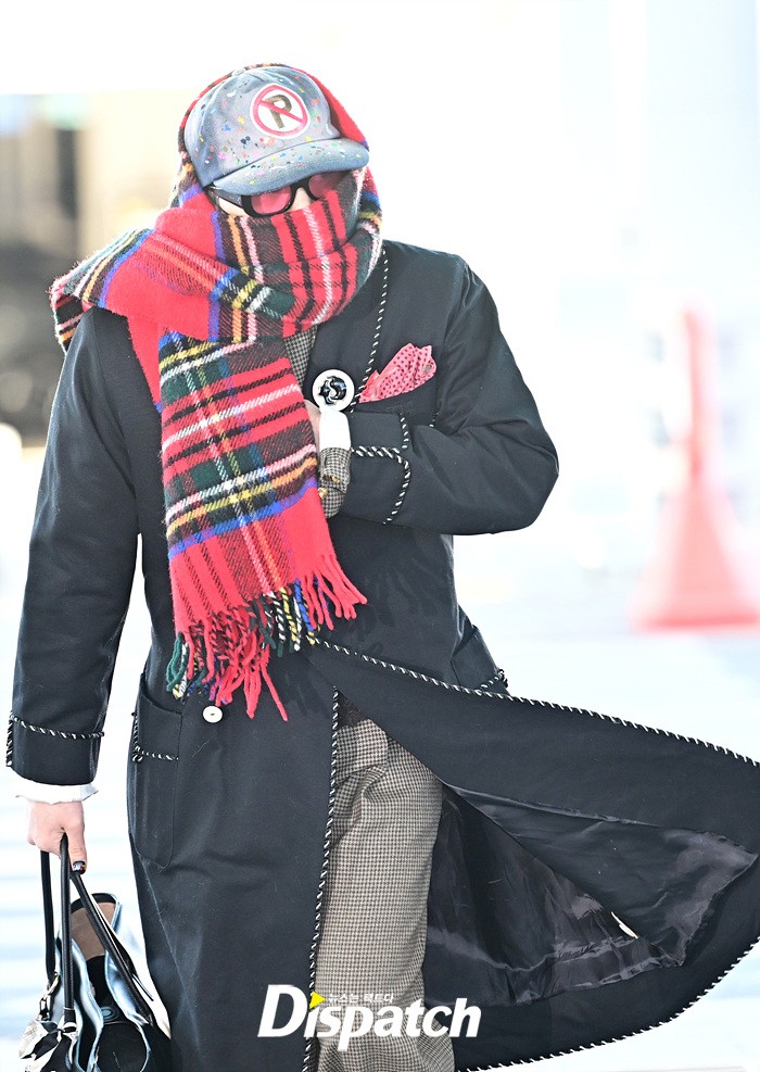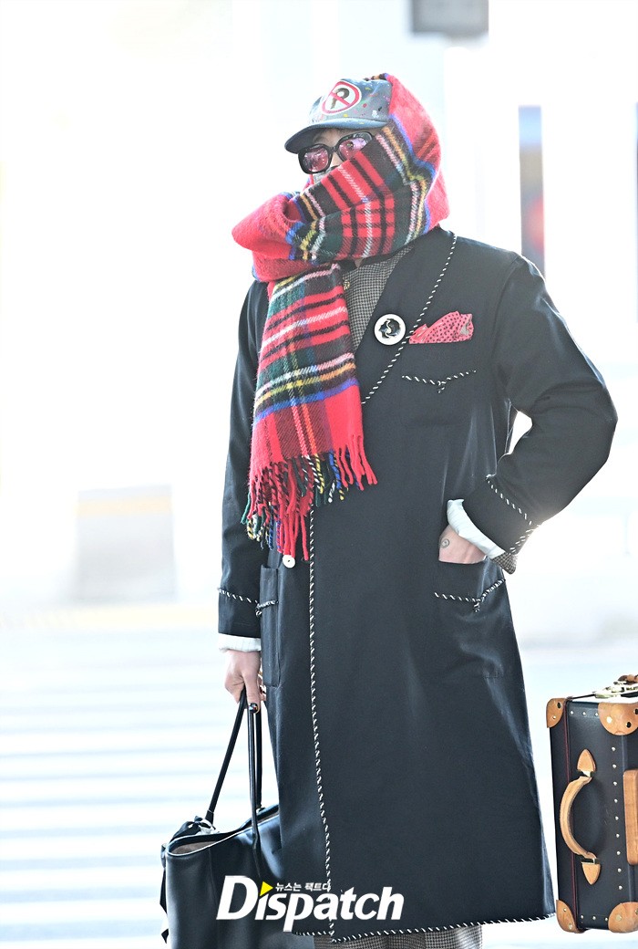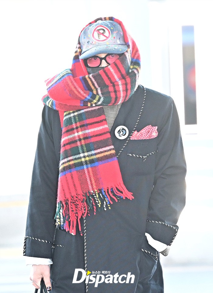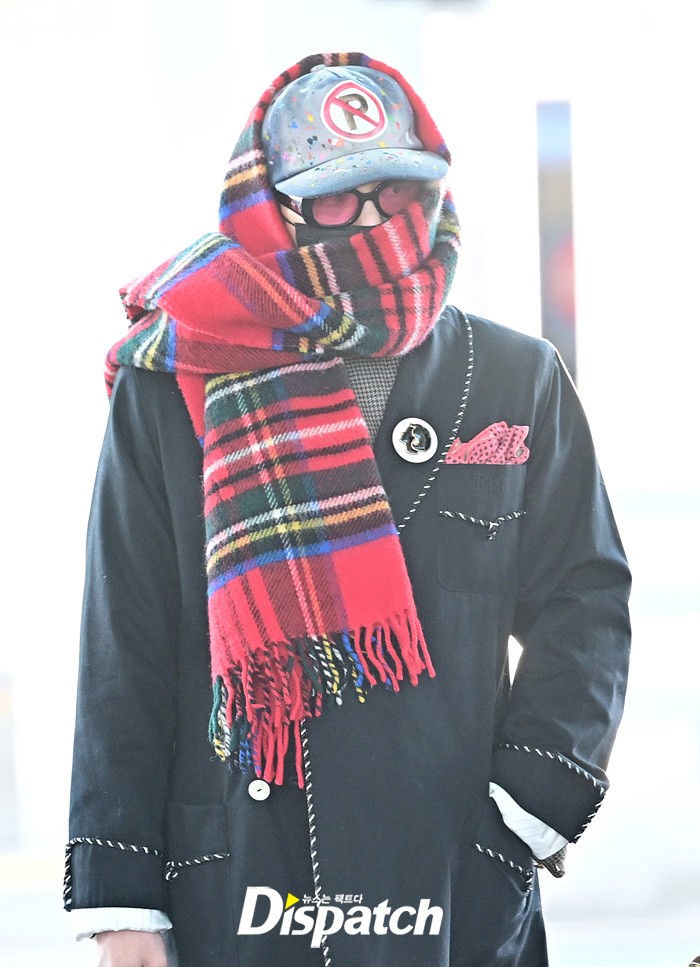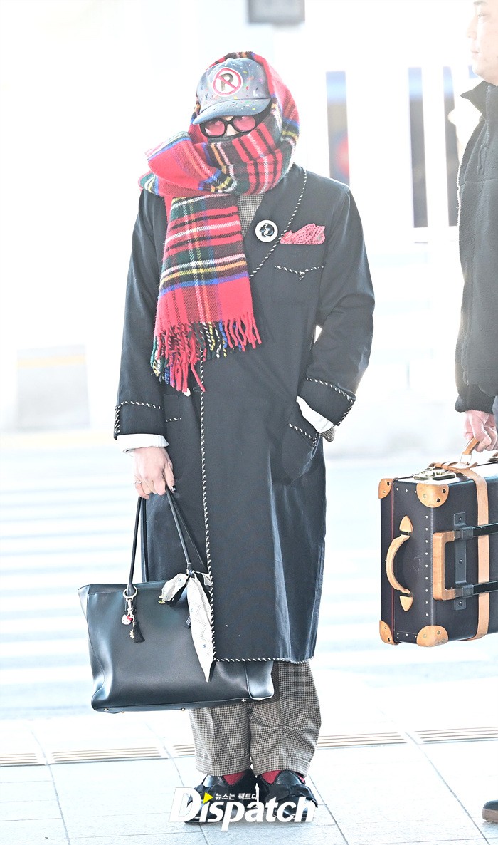 지드래곤은 강렬한 스타일로 시선을 사로 잡았다. 블랙 컬러의 롱코트와 체크 진, 마스크와 머플러로 남다른 패션감각을 뽐냈다.