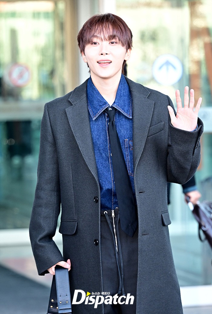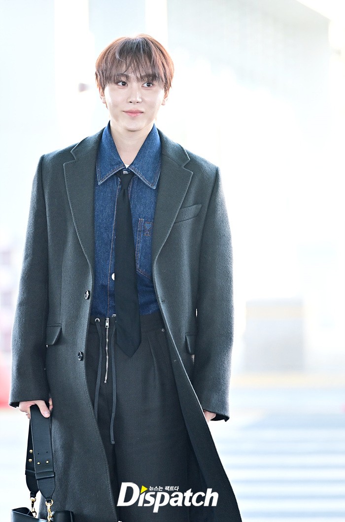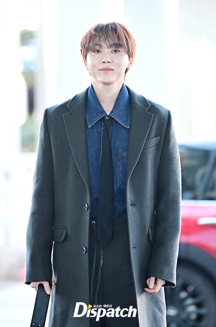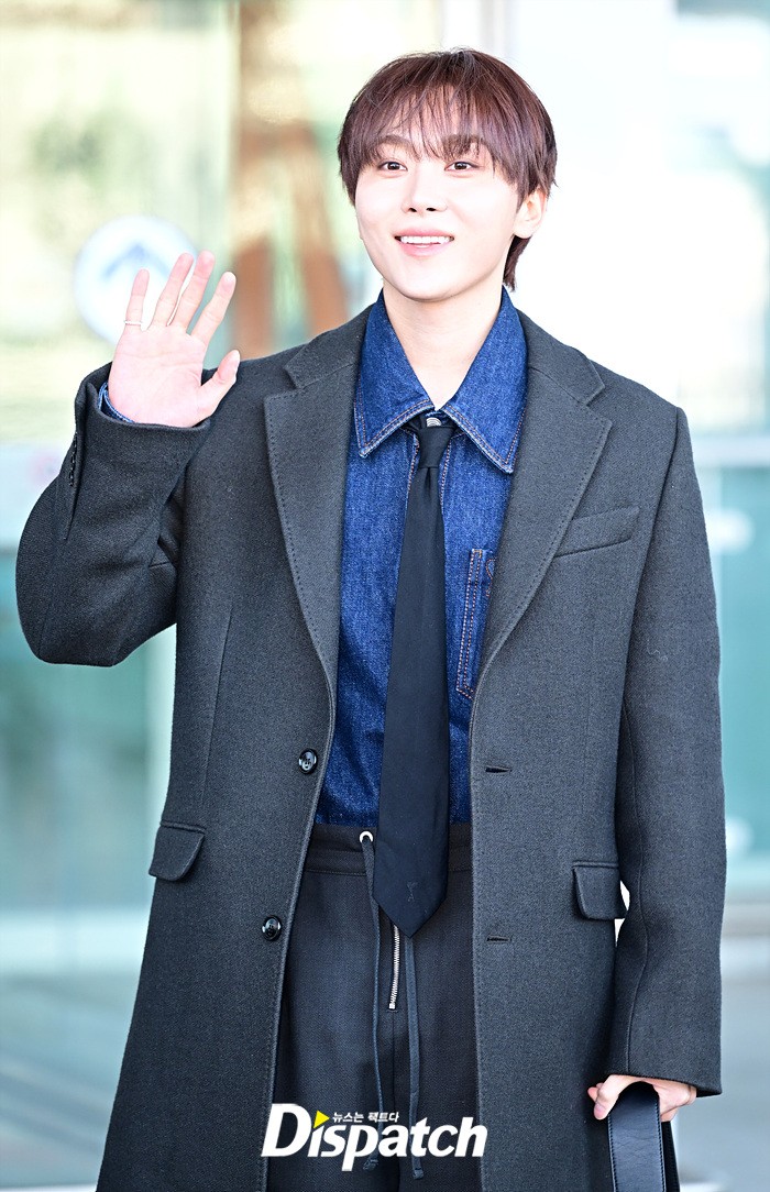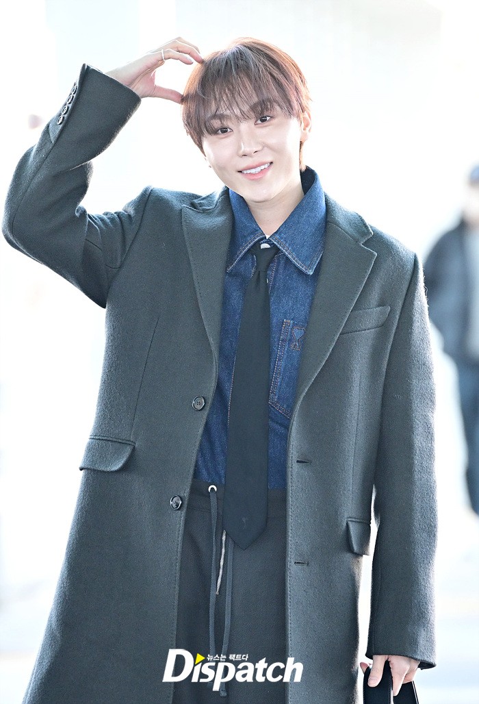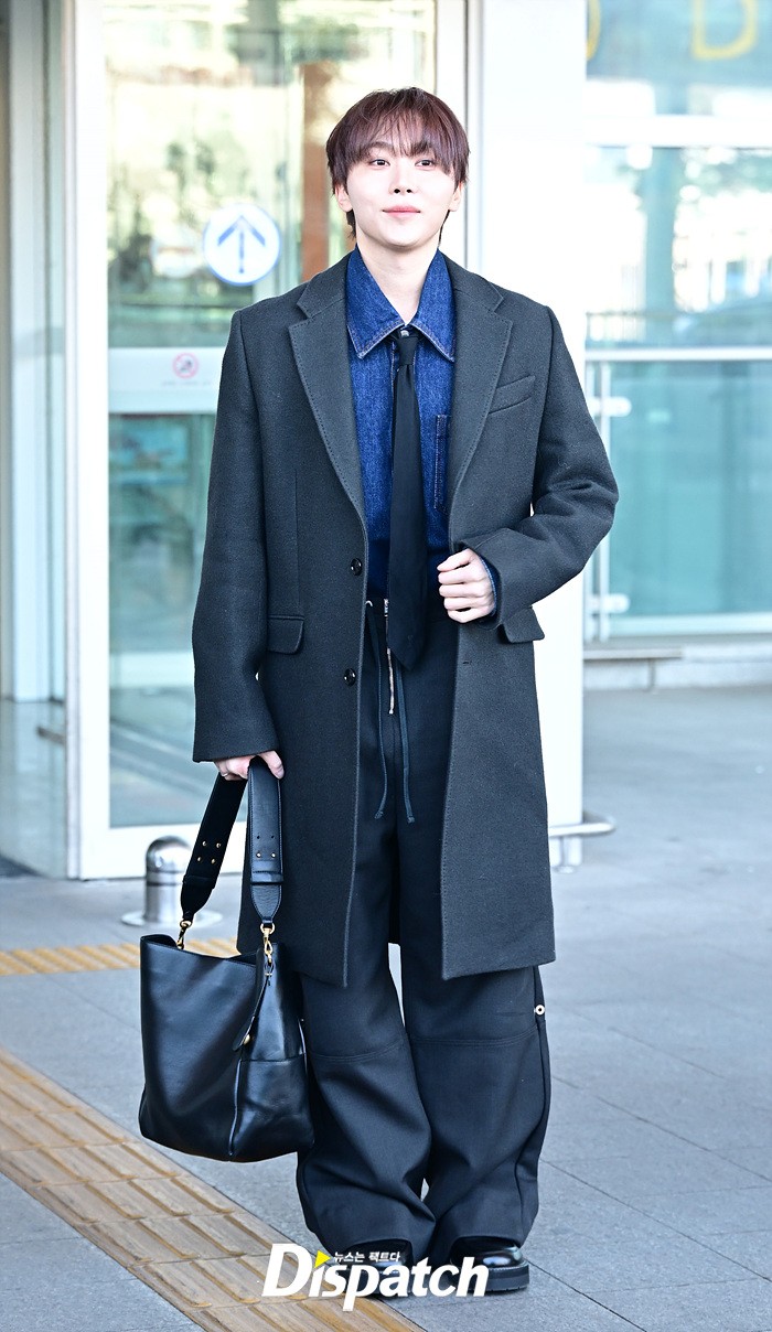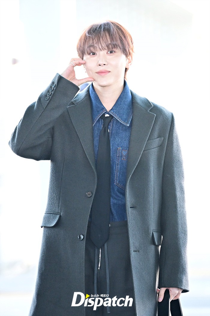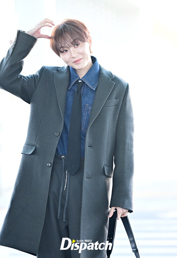 승관은 그레이 컬러의 롱코트와 와이드진으로 댄디한 공항패션을 완성했다. 공항에 모인 팬들을 위해 다양한 포즈로 화답했다.