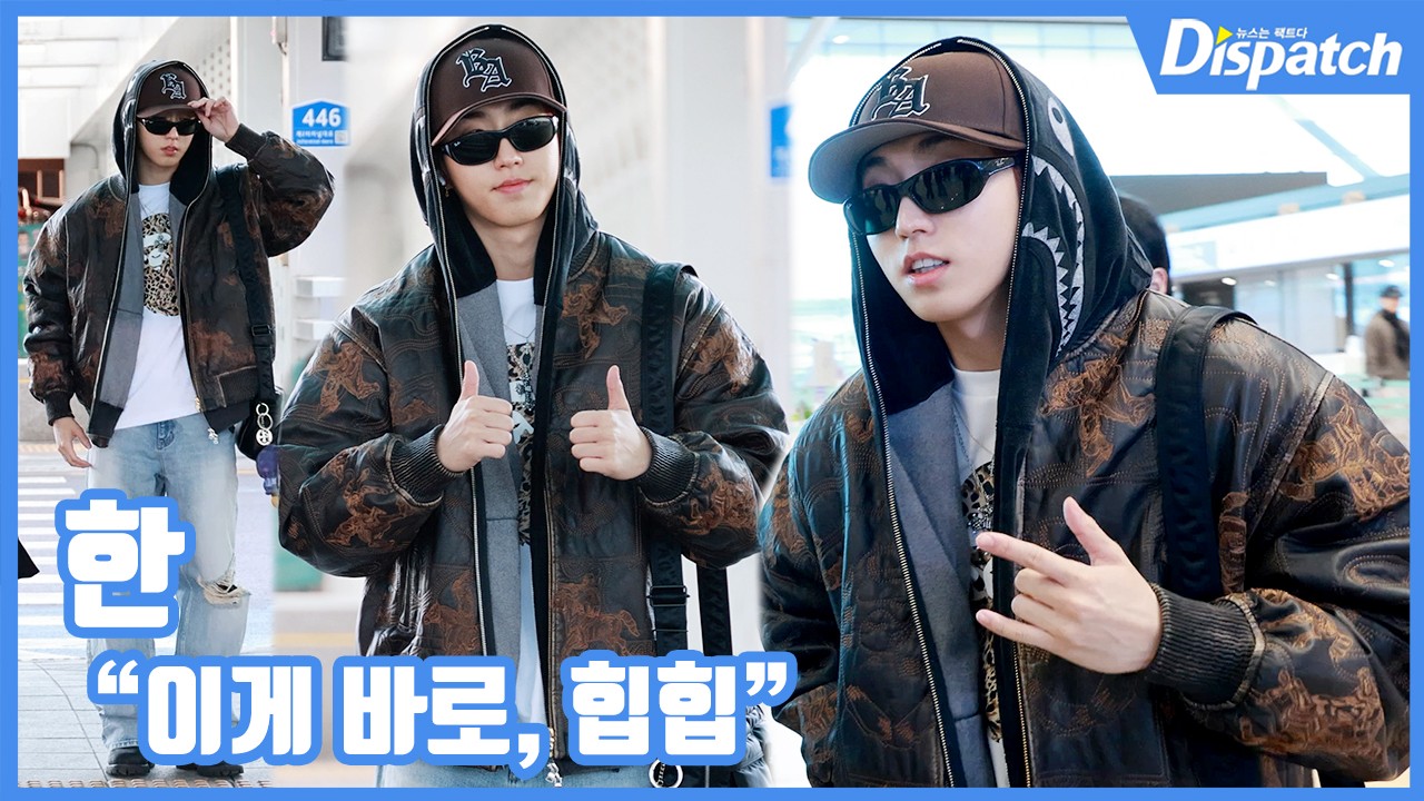 이날 한은 후드 집업 모자를 쓴 채 야구점퍼와 선글라스를 매치해 힙한 바이브를 완성하며 공항에 등장했다.