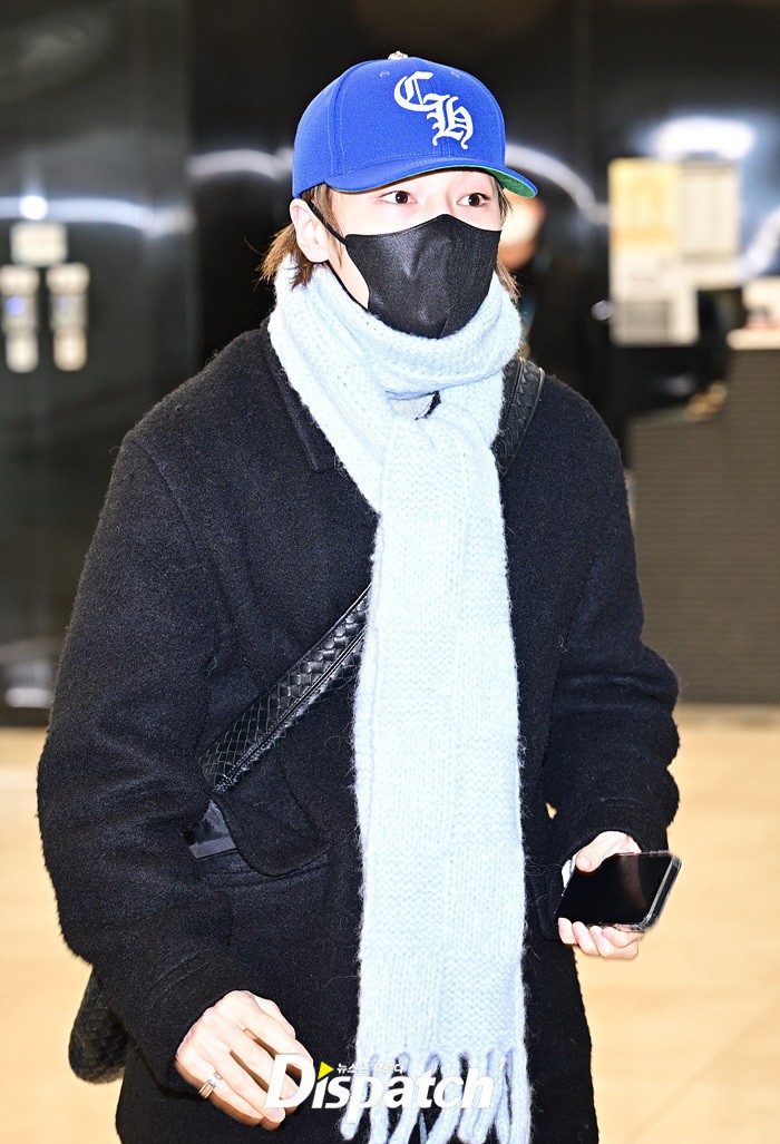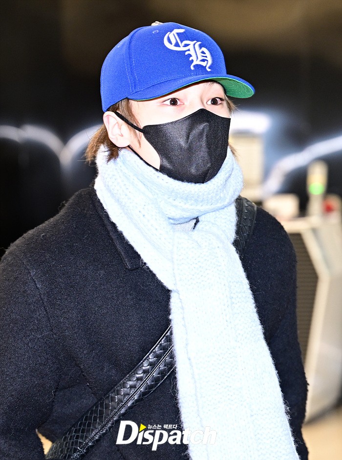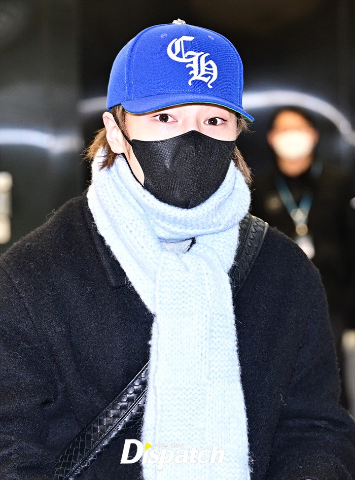 아이엔은 모자와 마스크, 머플러로 얼굴을 감쌌다. 강렬한 눈빛으로 입국장을 나서는 모습이였다.