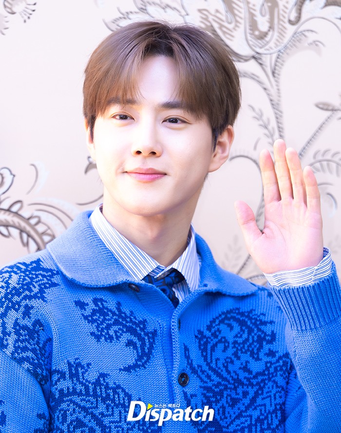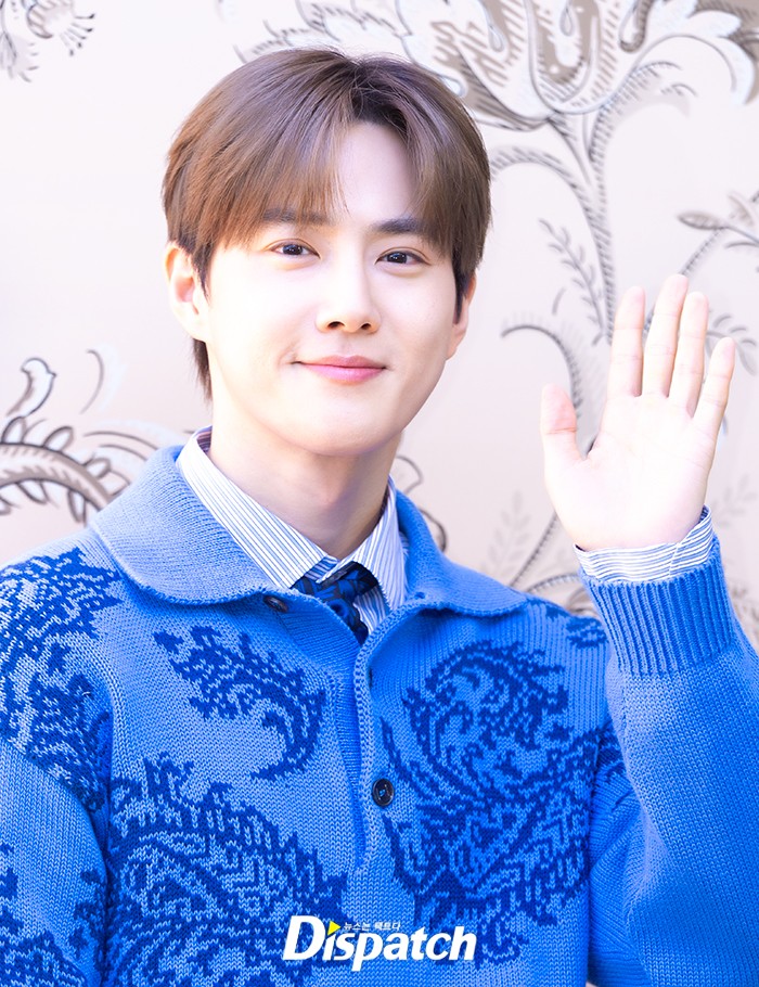 수호는 블루컬러 니트와 청바지로 멋을 냈다. 만찢남 비주얼로 시선을 사로잡았다.