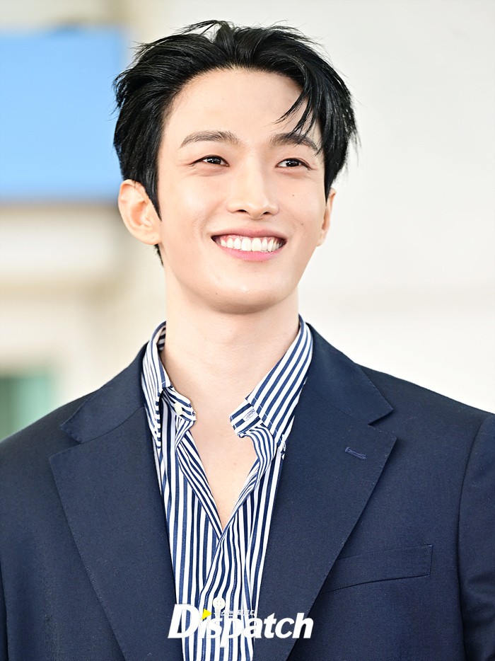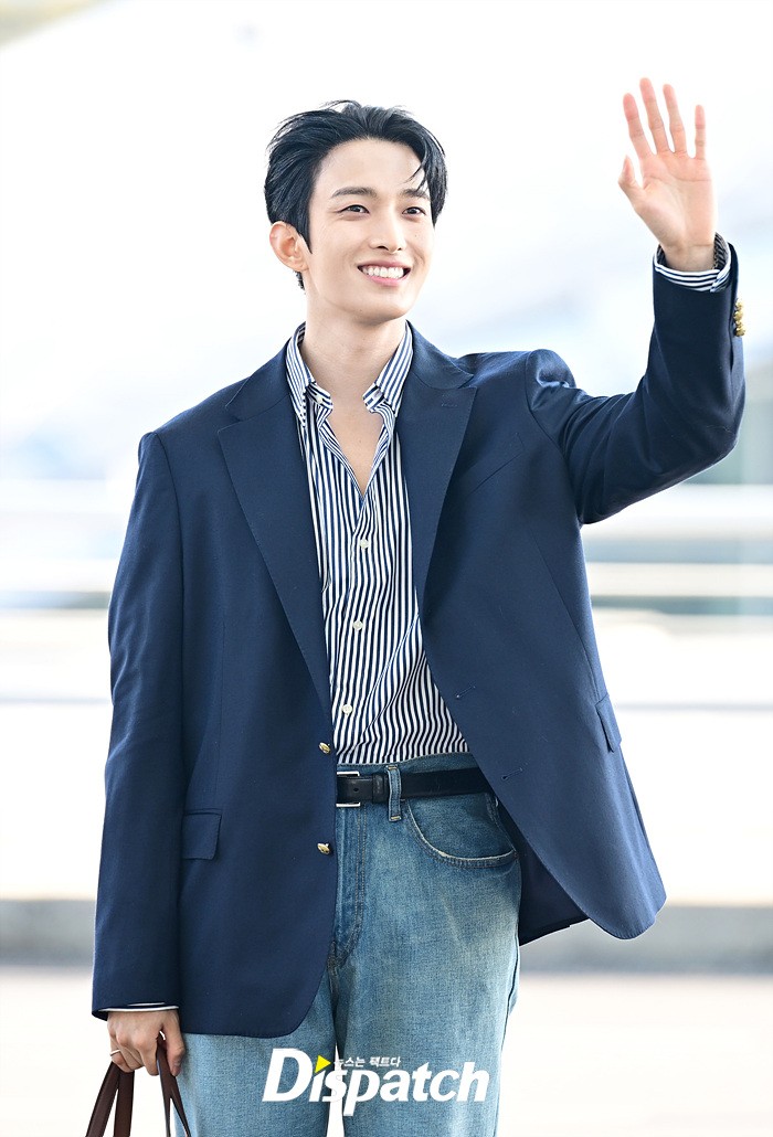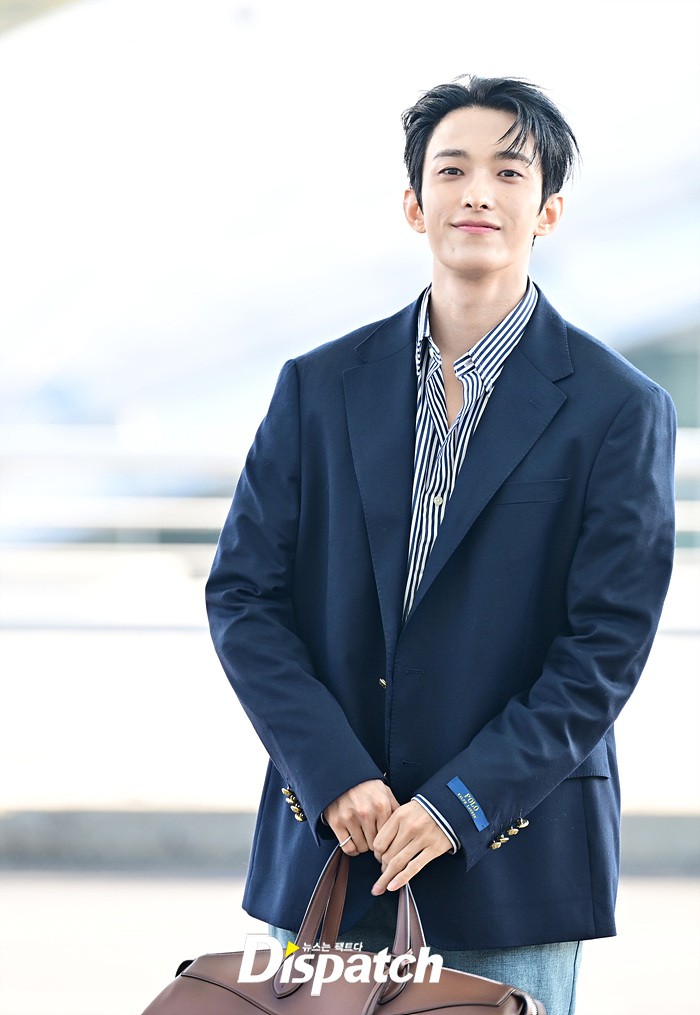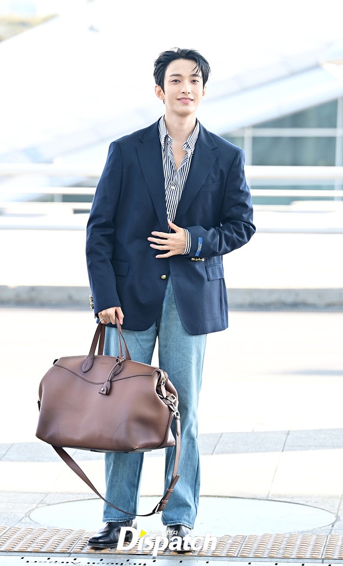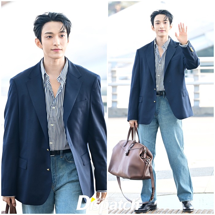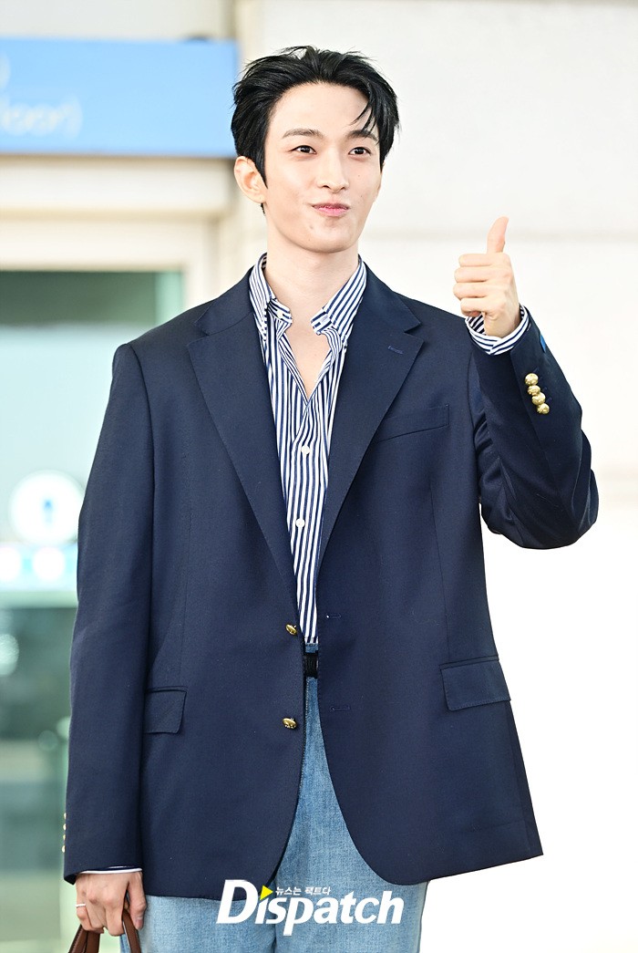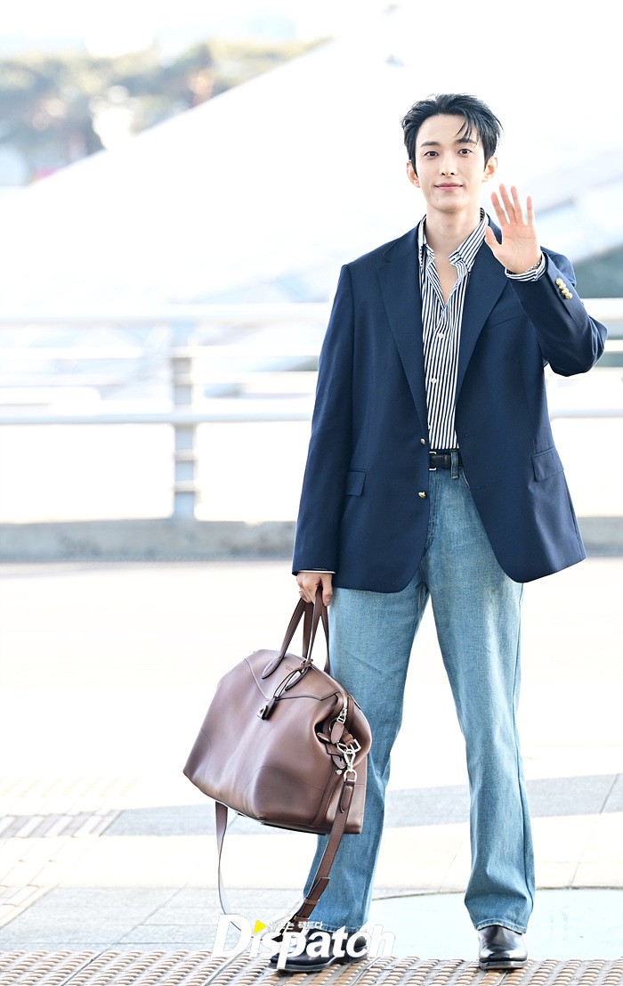도겸은 네이비 컬러의 재킷과 스트라이프 셔츠, 데님진으로 댄디한 공항패션을 완성했다. 조각같은 비주얼과 스윗한 미소가 돋보였다.