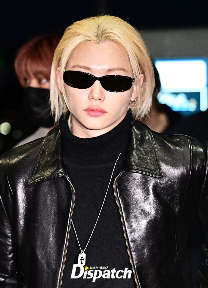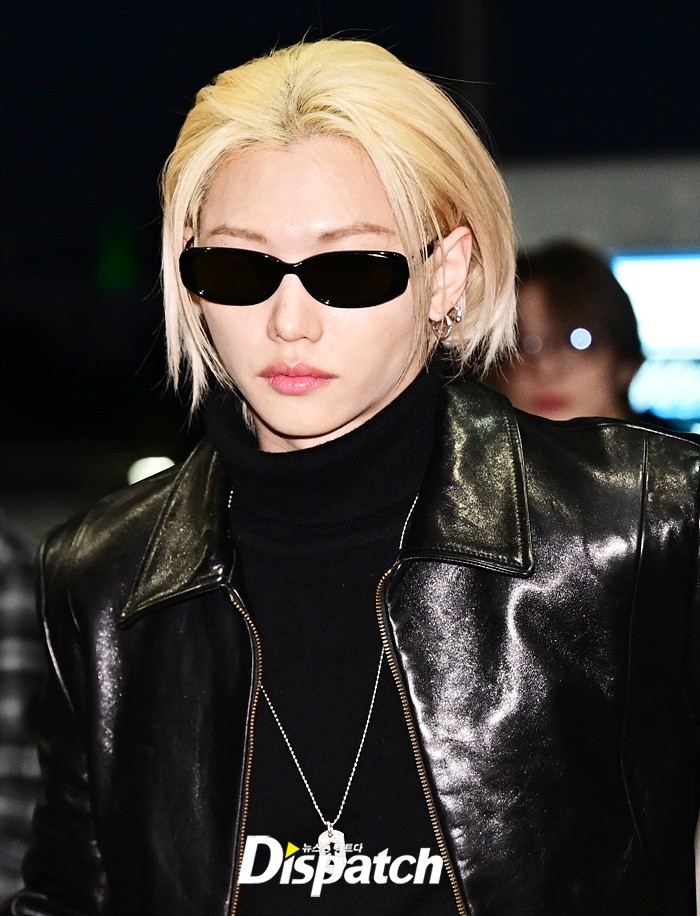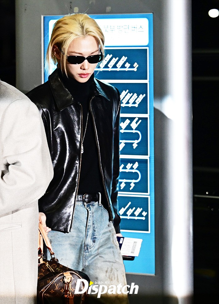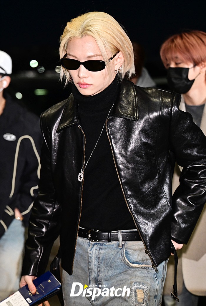 필릭스는 가죽재킷과 데님진, 선글라스로 시크한 공항패션을 완성했다. 눈부신 금발헤어와 조각같은 비주얼도 돋보였다.