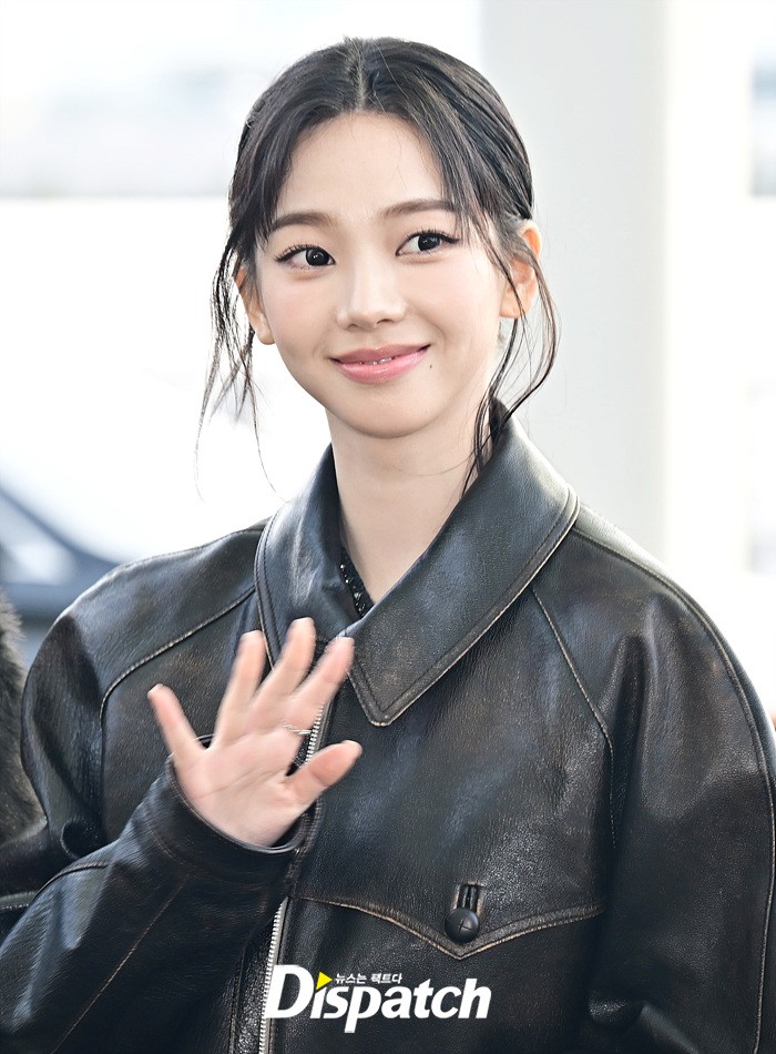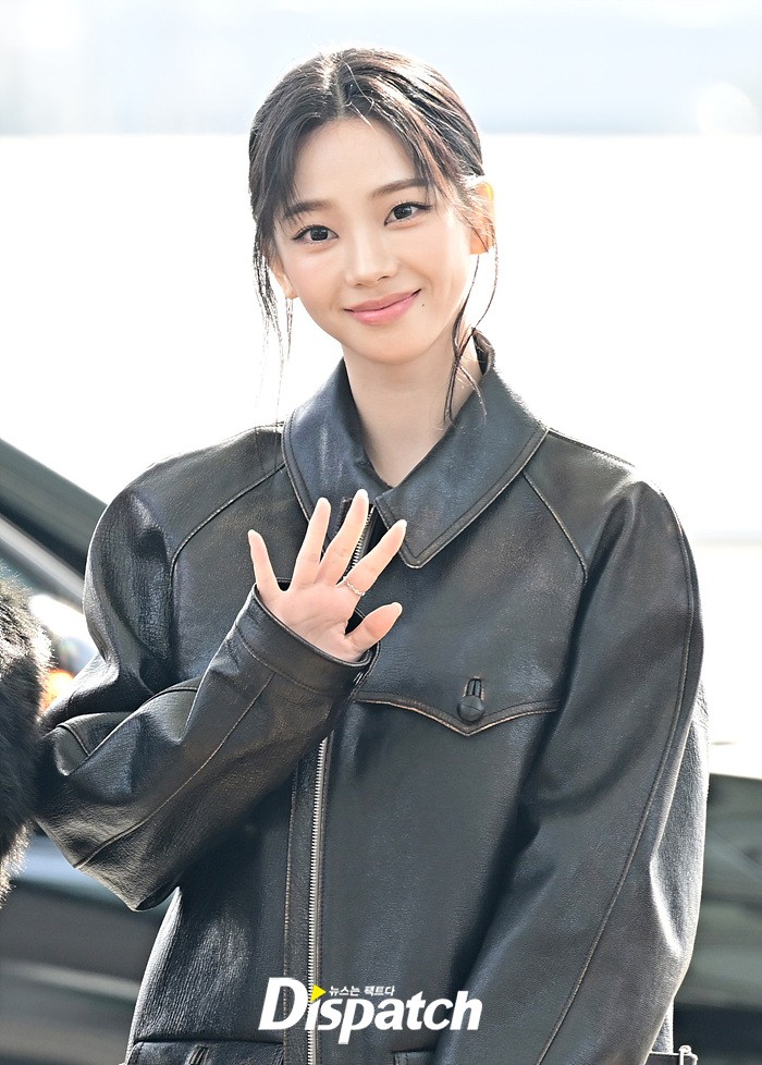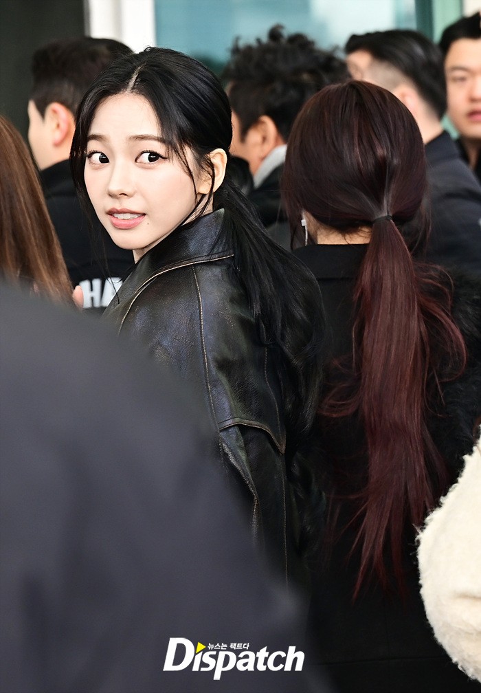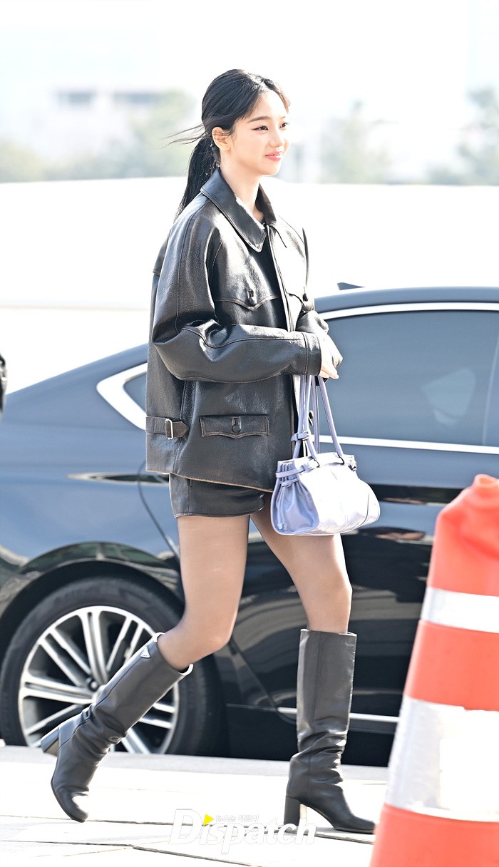 카리나는 가죽소재의 재킷과 팬츠로 시크한 공항패션을 완성했다. 청순한 비주얼과 러블리한 미소도 돋보였다.