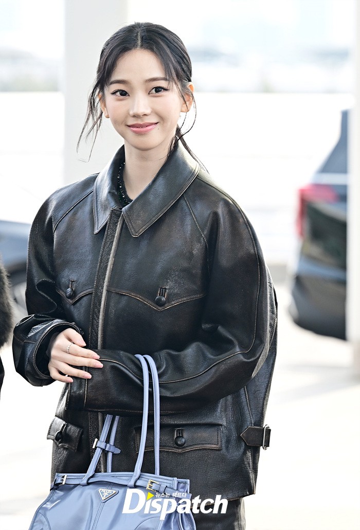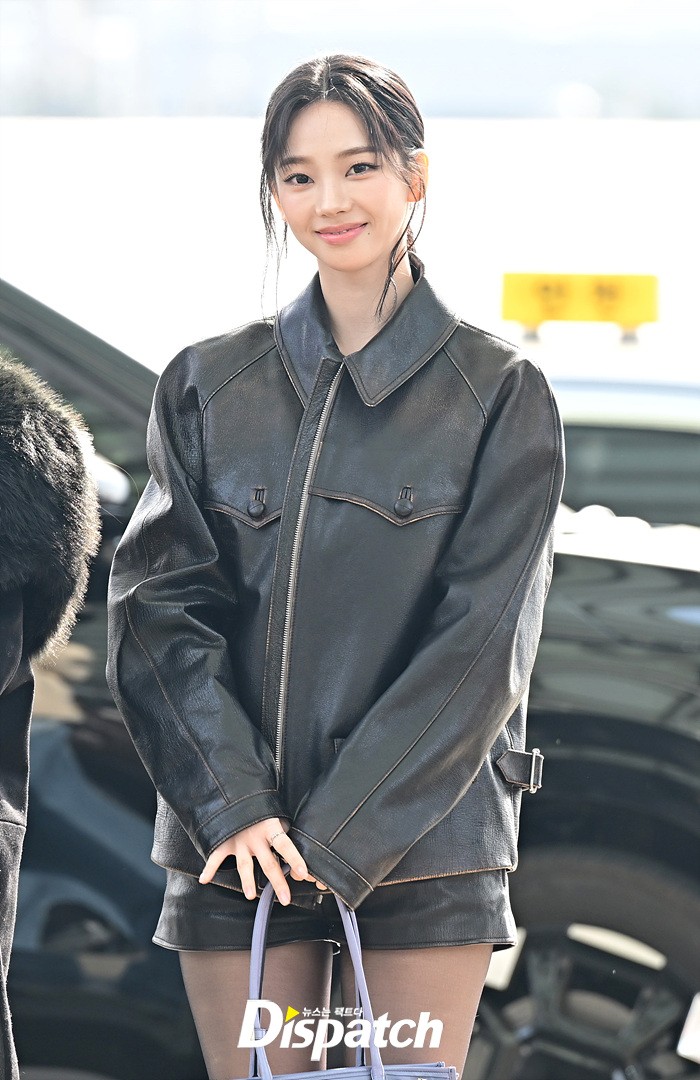 카리나는 가죽소재의 재킷과 팬츠로 시크한 공항패션을 완성했다. 청순한 비주얼과 러블리한 미소도 돋보였다.