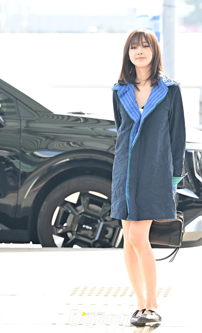 지젤은 네이비 컬러의 롱재킷과 블루셔츠로 산뜻한 공항패션을 완성했다. 청순한 비주얼과 러블리한 미소가 돋보였다.