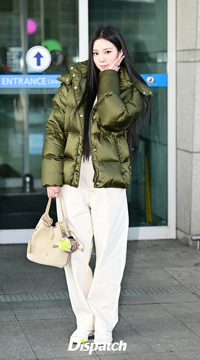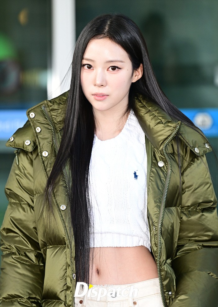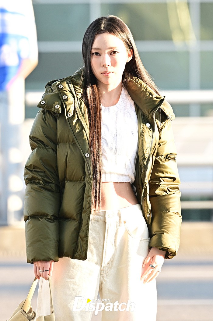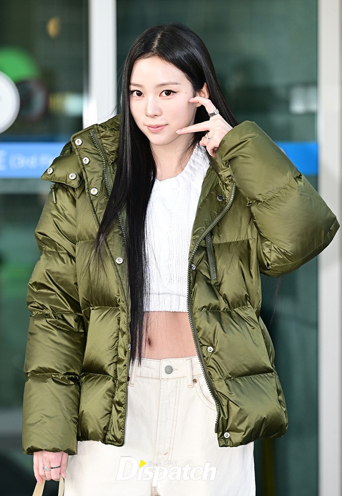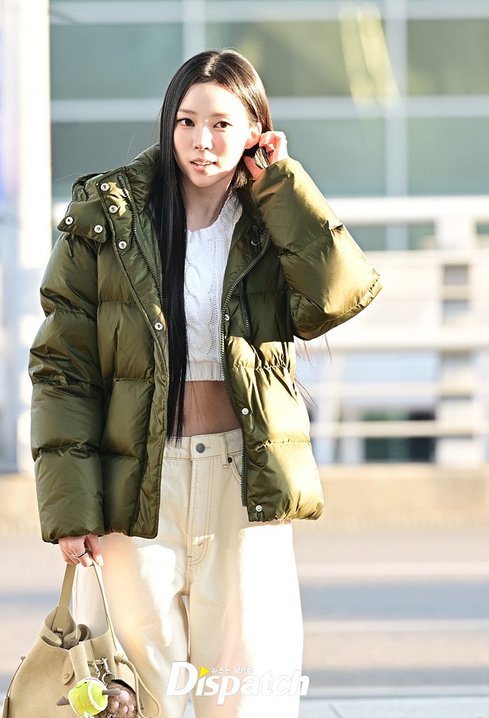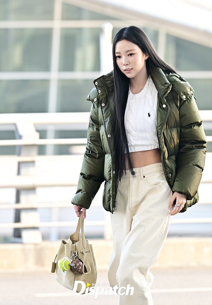 나린은 카키 컬러 패딩과 크롭톱, 와이드 팬츠로 캐주얼한 공항패션을 완성했다. 인형같은 이목구비와 러블리한 미소가 돋보였다.