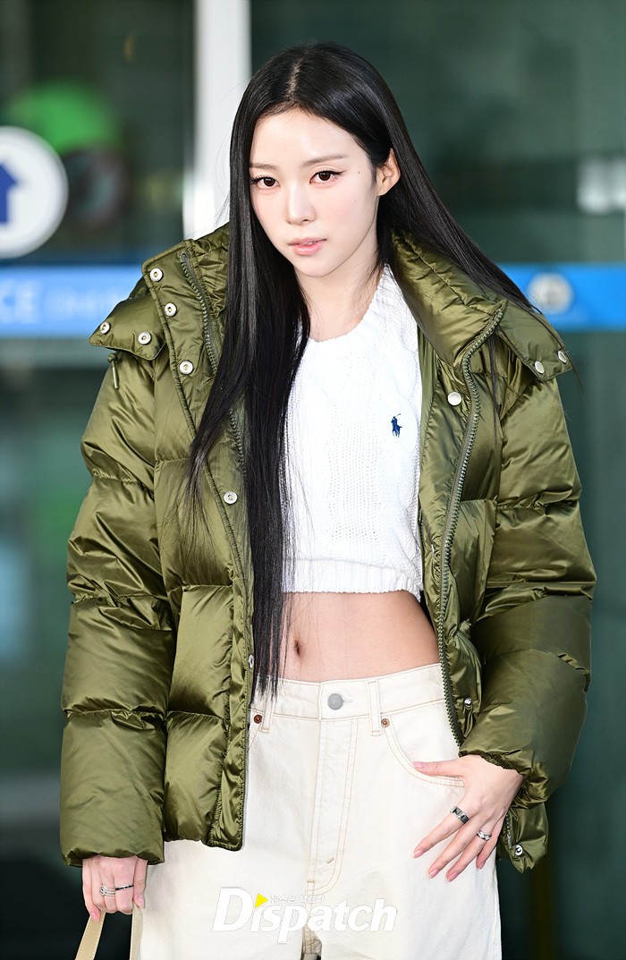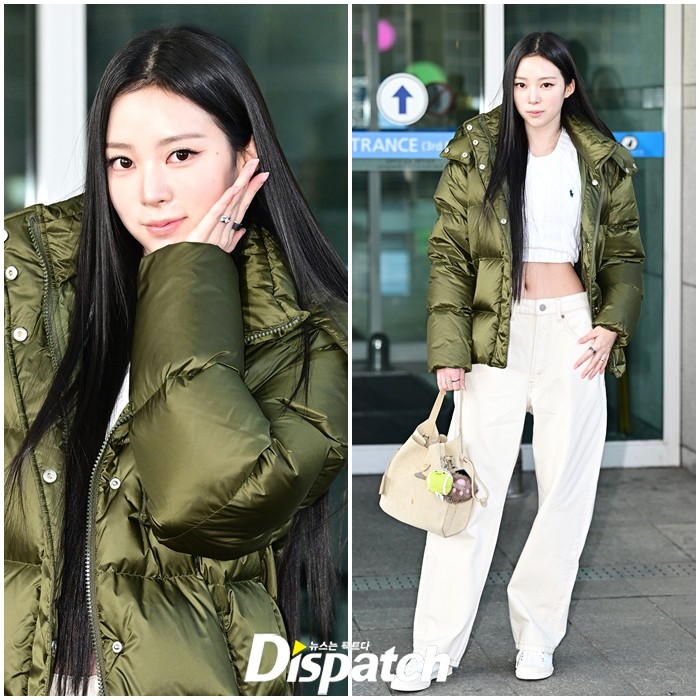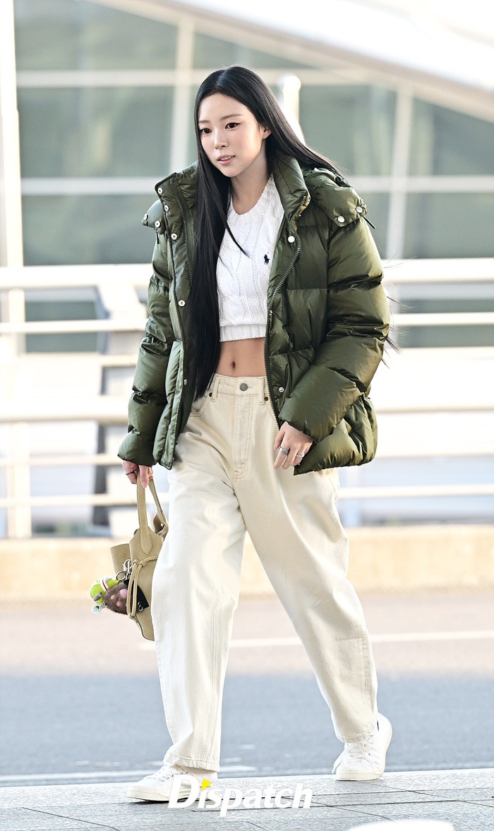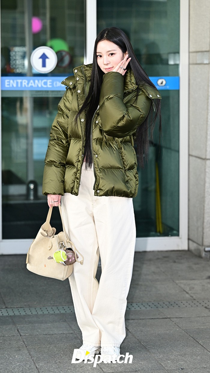 나린은 카키 컬러 패딩과 크롭톱, 와이드 팬츠로 캐주얼한 공항패션을 완성했다. 인형같은 이목구비와 러블리한 미소가 돋보였다.