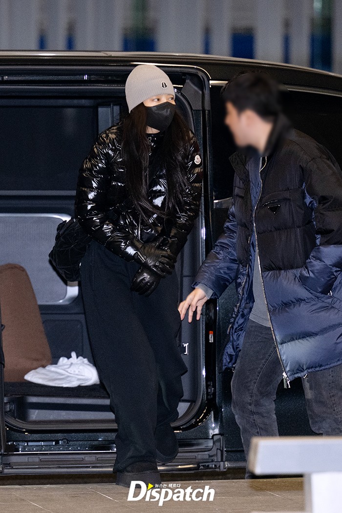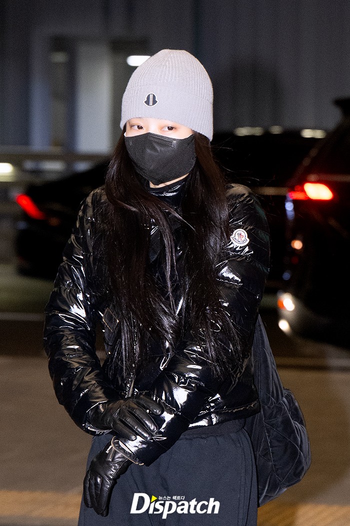 제니는 블랙 팬츠에 패딩을 매치해 시크한 공항패션을 연출했다. 인형같은 미모가 돋보였다.