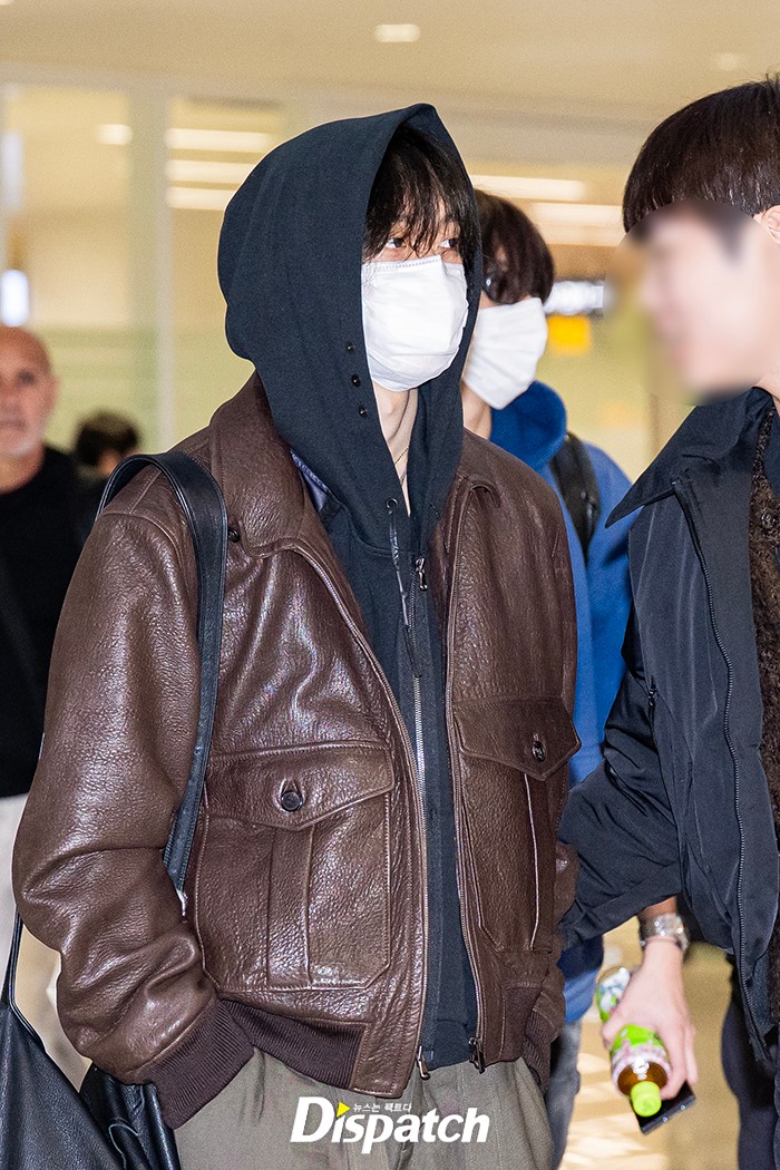 원빈은 브라운 레더 재킷과 집업 후드로 멋을 냈다. 잘생긴 비주얼이 돋보였다.