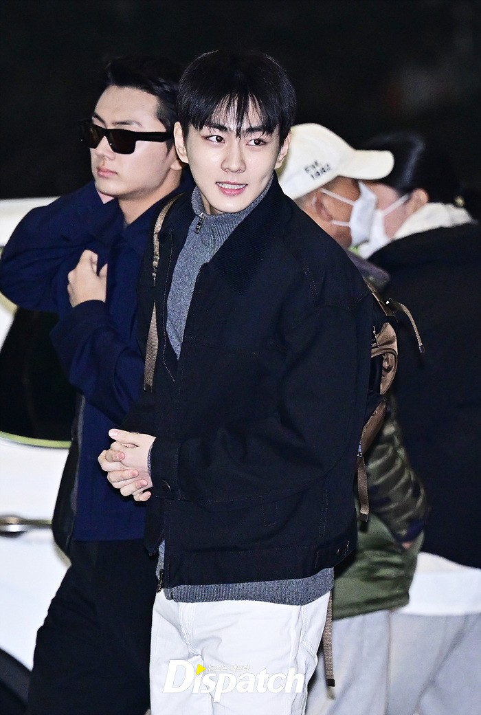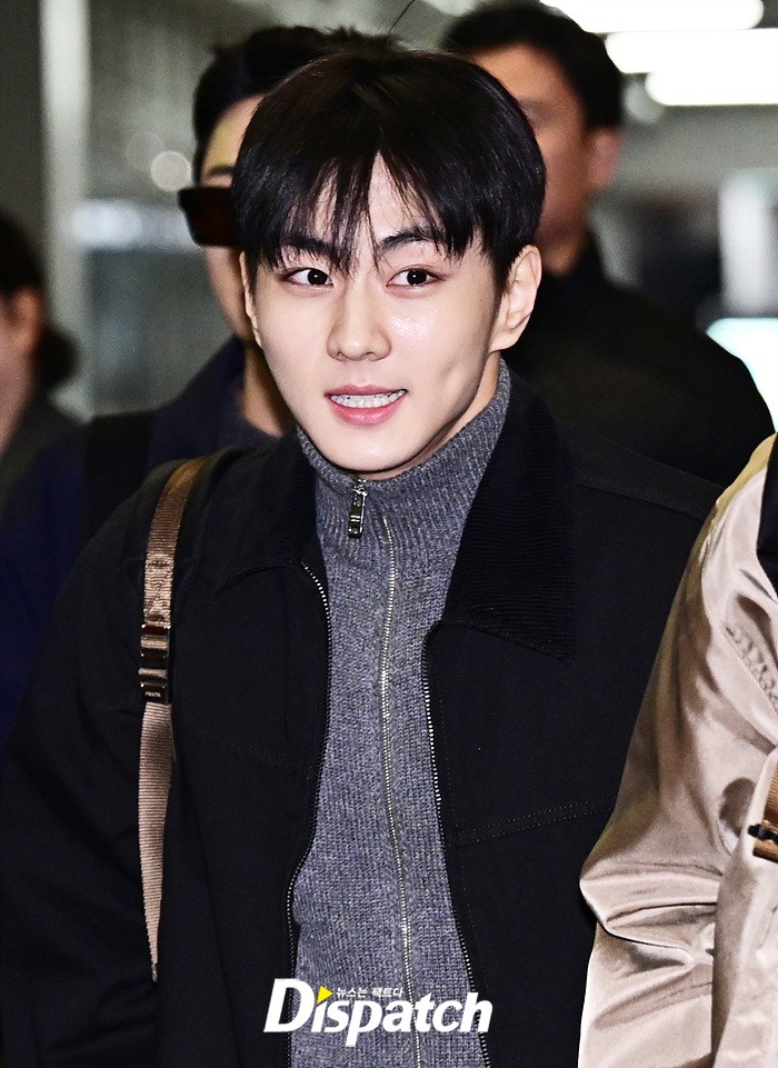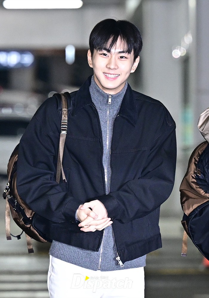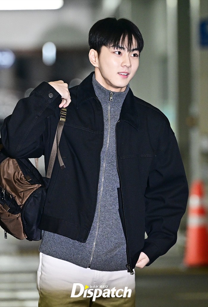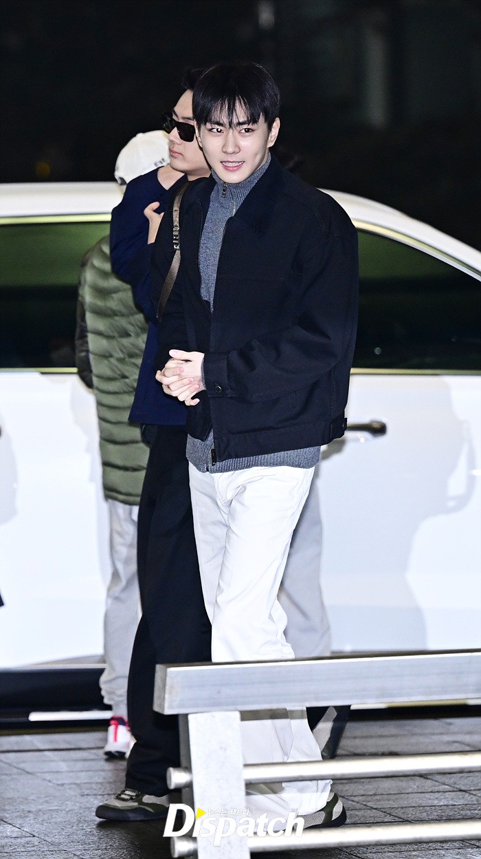 정원은 블랙 컬러의 재킷과 화이트 팬츠로 댄디한 공항패션을 완성했다. 훈훈한 비주얼과 스윗한 미소가 돋보였다.