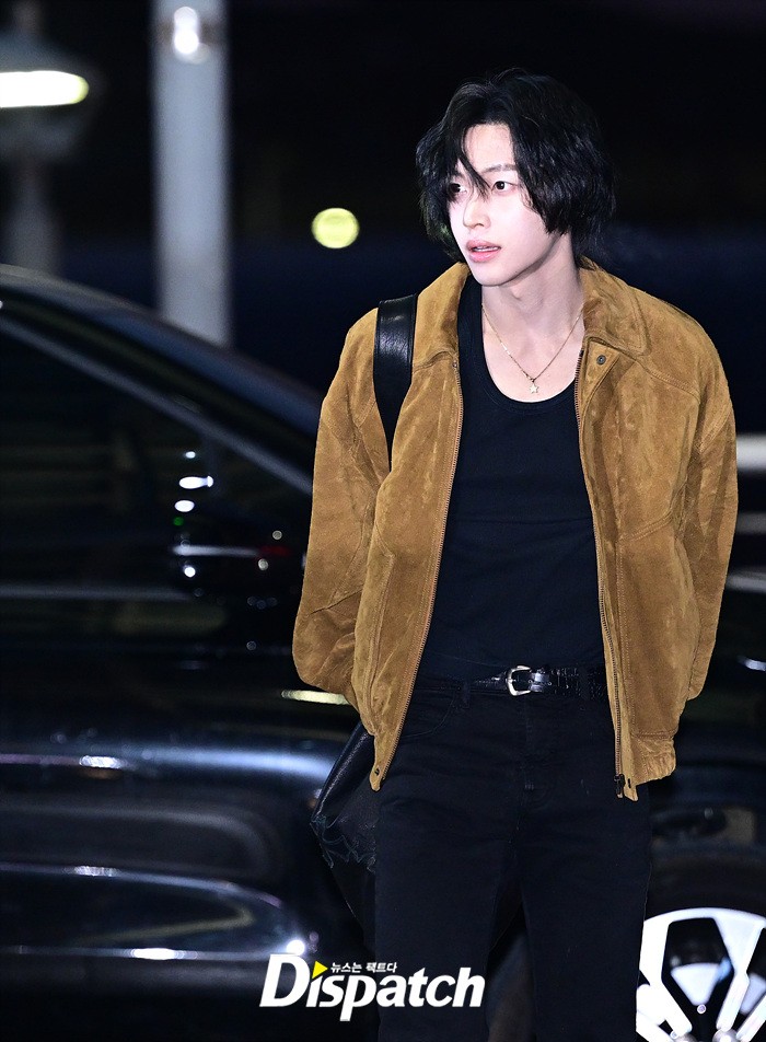 원빈은 브라운 컬러의 재킷과 블랙진으로 센스있는 스타일링을 완성했다. 조각같은 비주얼로 여심을 사로 잡았다.