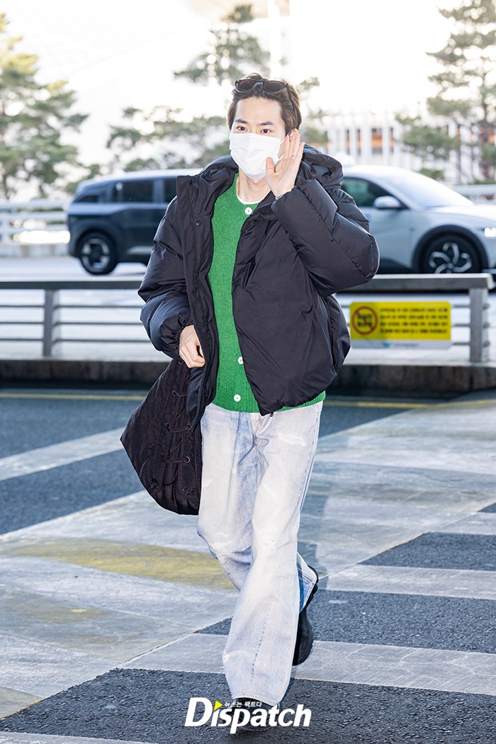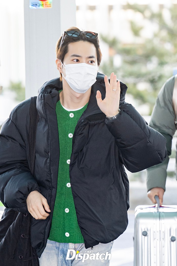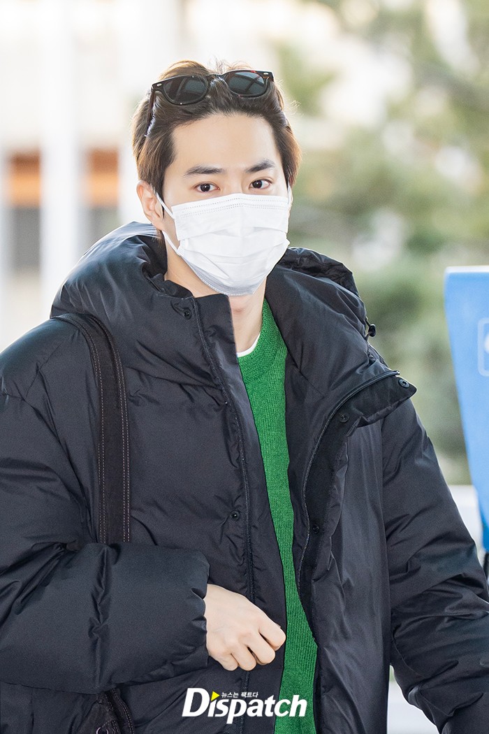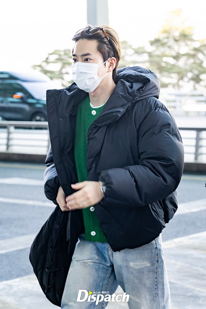 수호는 그린 가디건과 블랙 패딩, 데님 팬츠로 멋을 냈다. 잘생긴 비주얼이 시선을 사로잡았다.