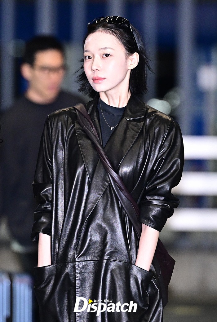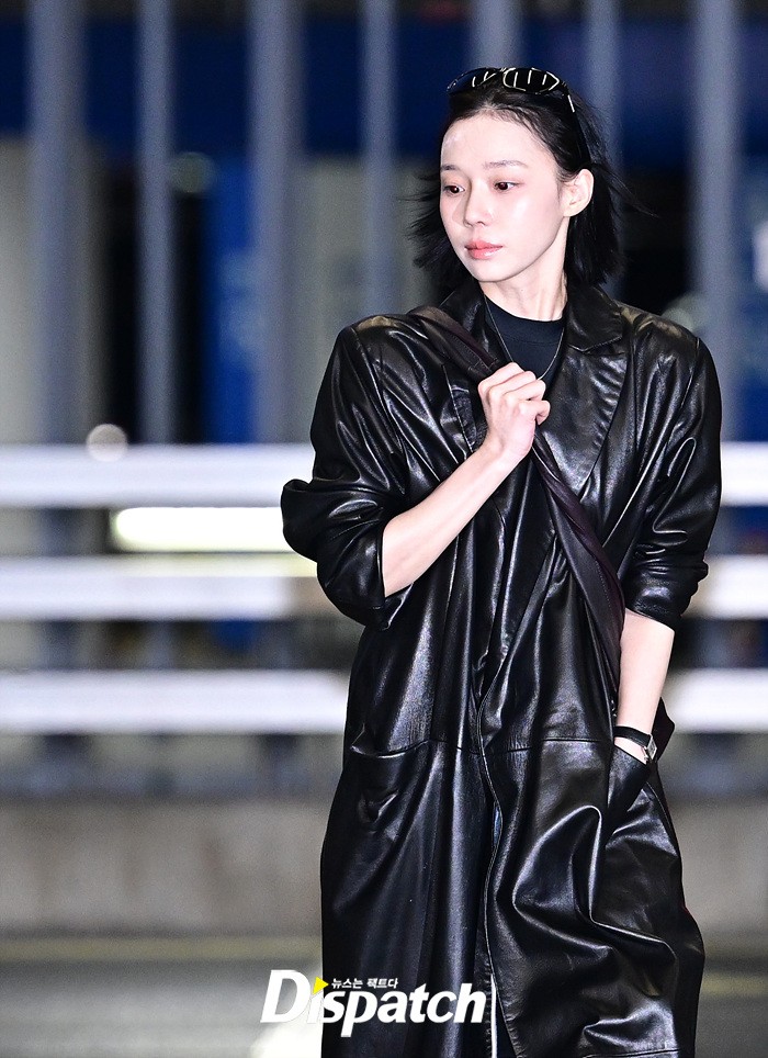 윈터는 가죽 소재의 롱코트와 데님진으로 시크한 공항패션을 완성했다. 화장기 없는 얼굴에도 청순한 매력이 돋보였다.