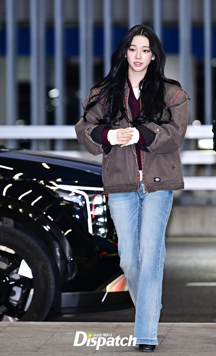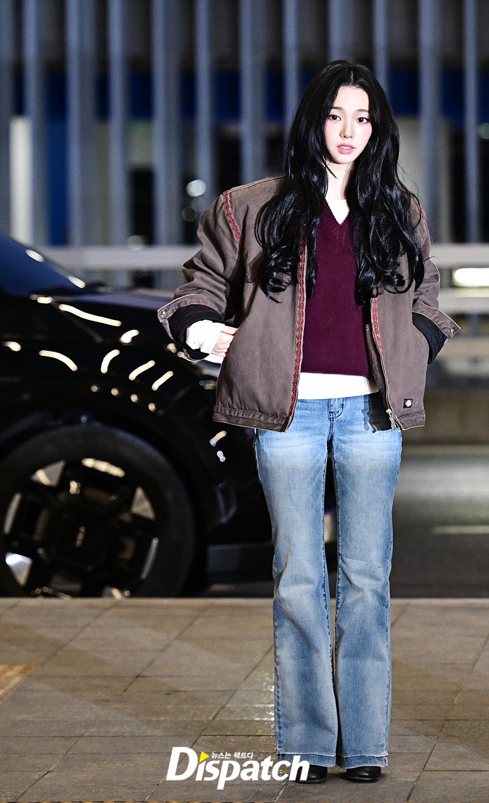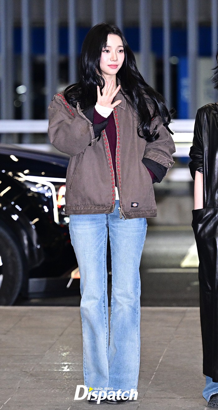 카리나는 브라운 컬러의 재킷과 데님진으로 캐주얼한 공항패션을 연출했다. 청순한 비주얼과 러블리한 미소가 돋보였다.