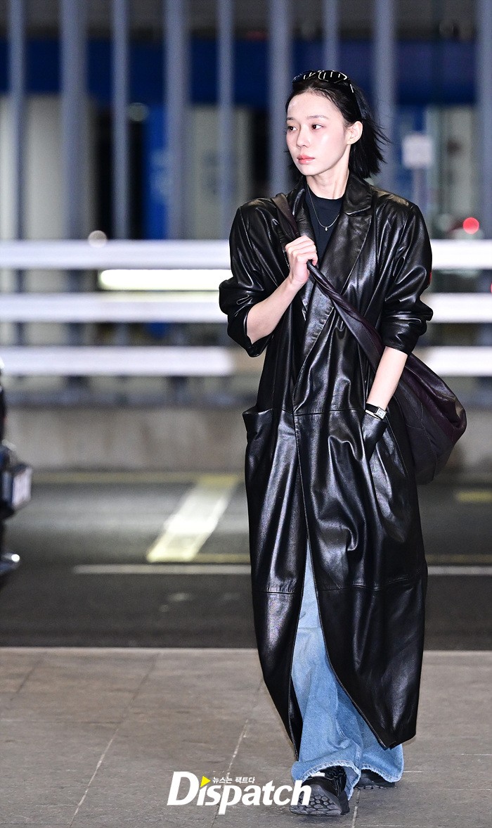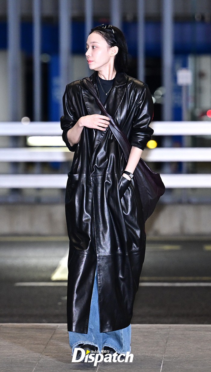 윈터는 가죽 소재의 롱코트와 데님진으로 시크한 공항패션을 완성했다. 화장기 없는 얼굴에도 청순한 매력이 돋보였다.