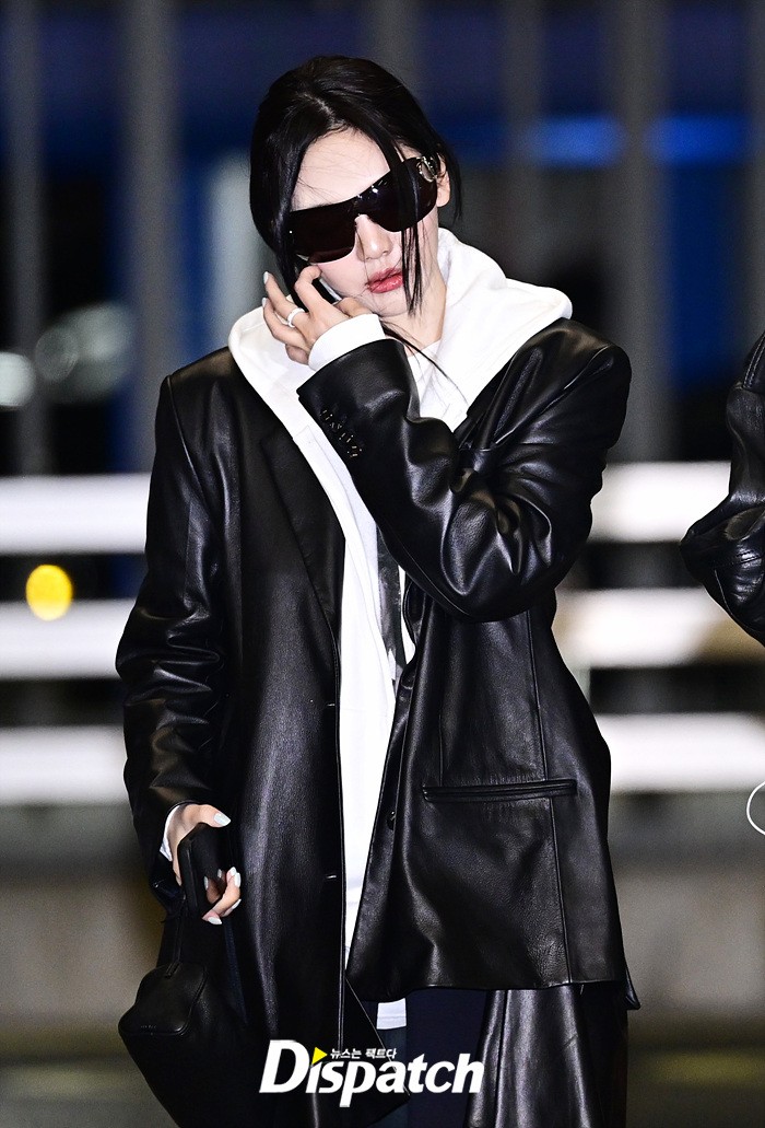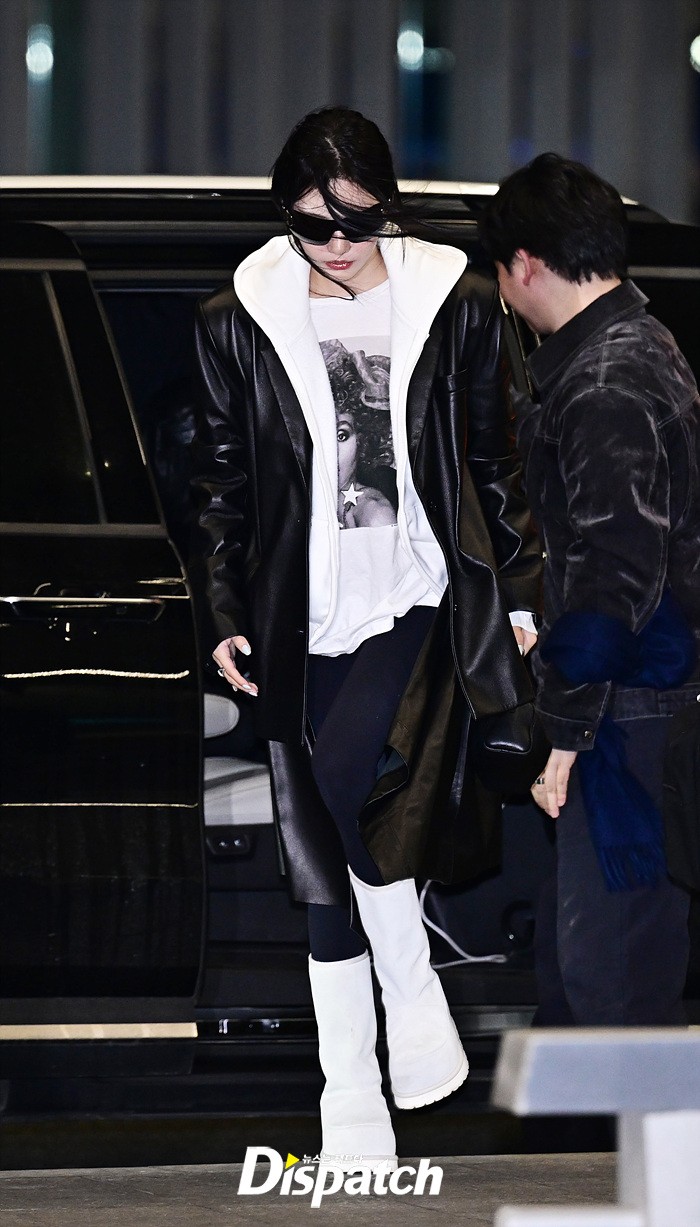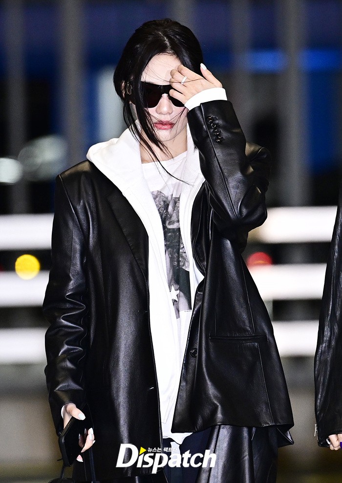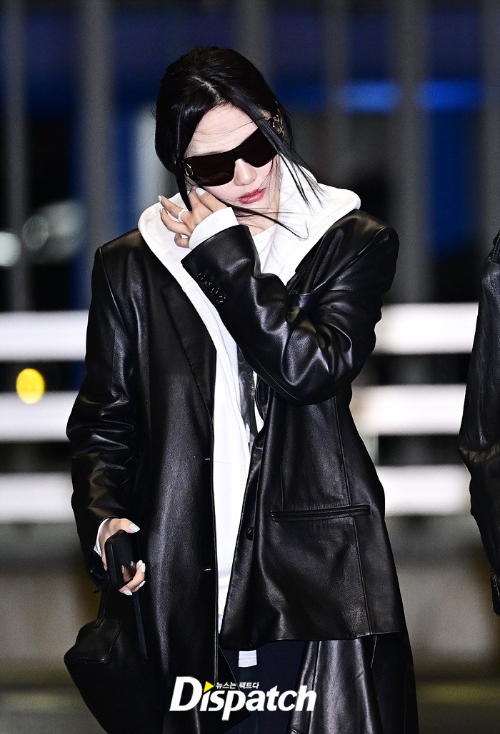 닝닝은 가죽 소재의 블랙 코트와 화이트 후드집업으로 심플한 공항패션을 완성했다. 헝클어진 머리에도 강렬한 카리스마가 돋보였다.