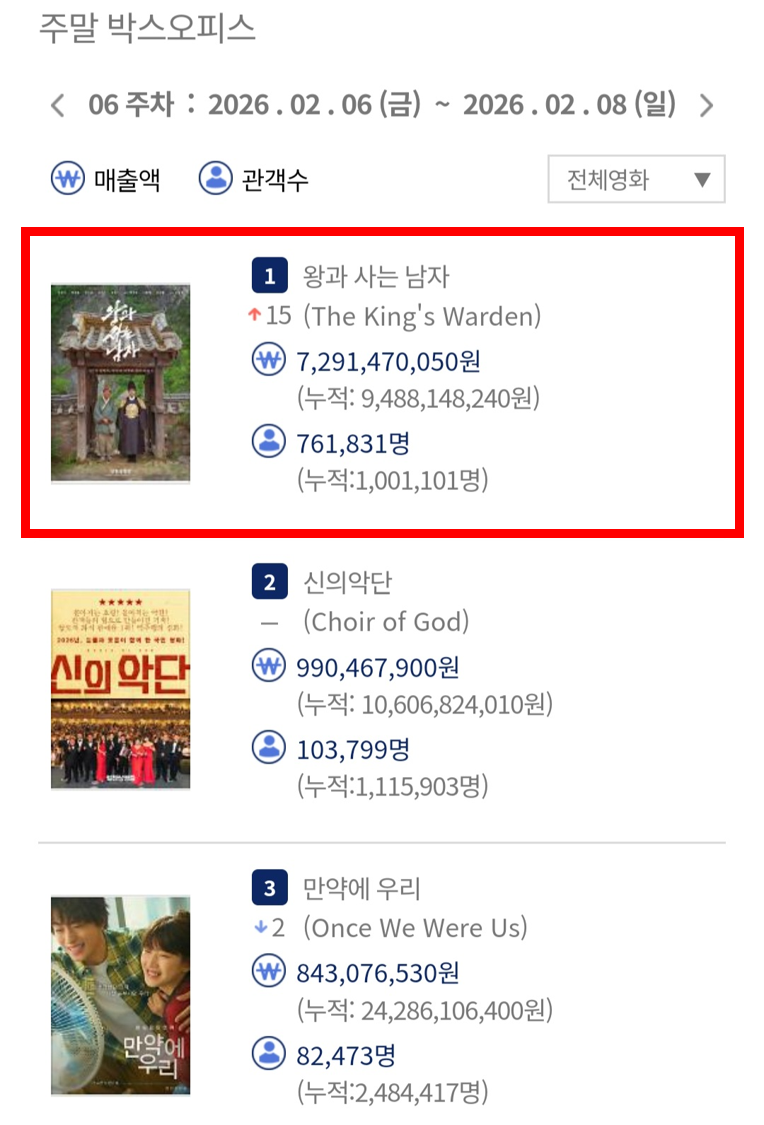 영진위 영화관입장권 통합전산망에 따르면, '왕과 사는 남자'는 지난 주말(6~8일) 동안 관객수 76만 1,831명을 기록했다.