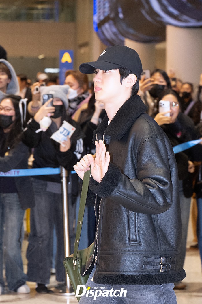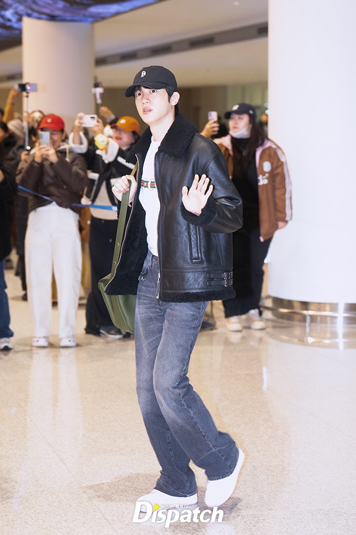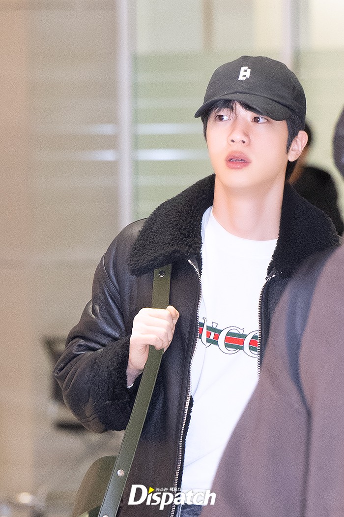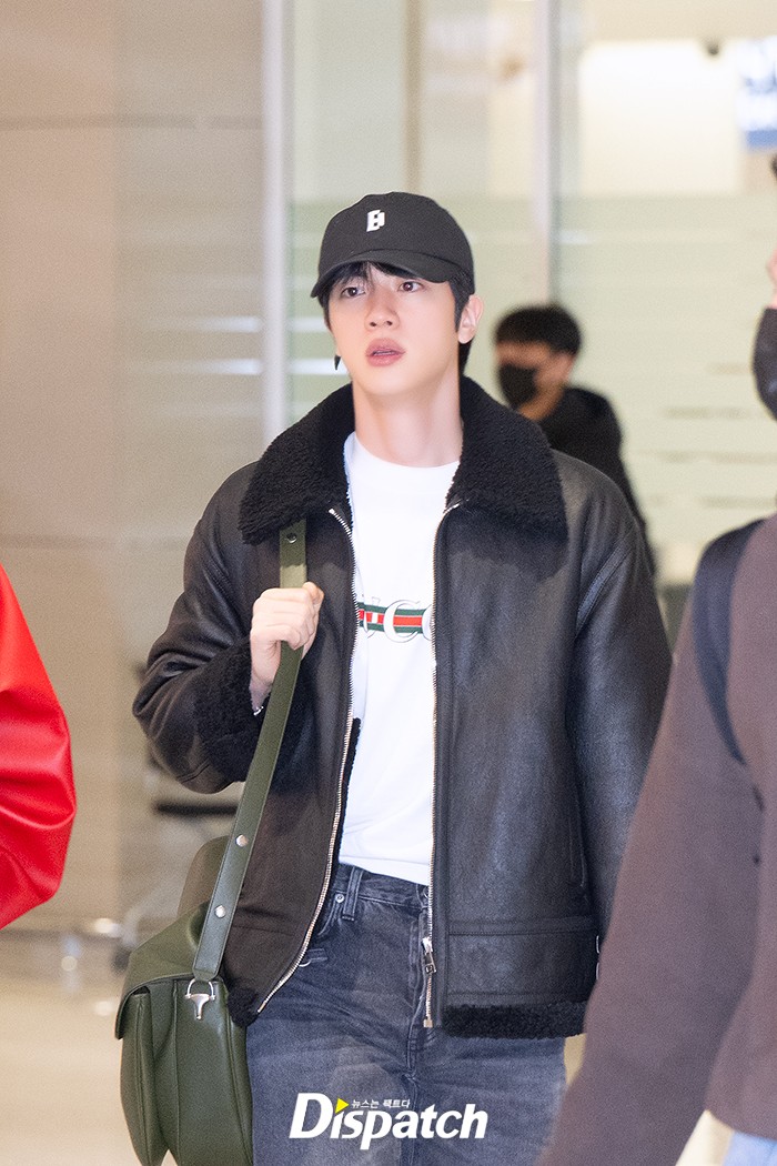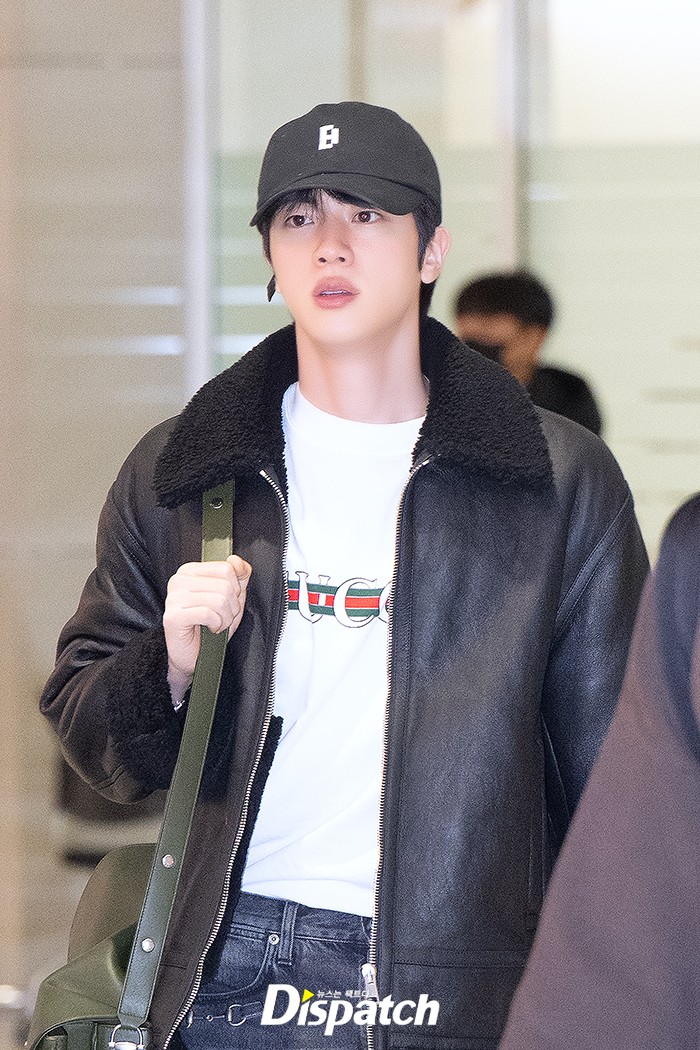 진은 데님 팬츠에 블랙 재킷으로 시크한 공항패션을 연출했다. 훈훈한 비주얼이 돋보였다.