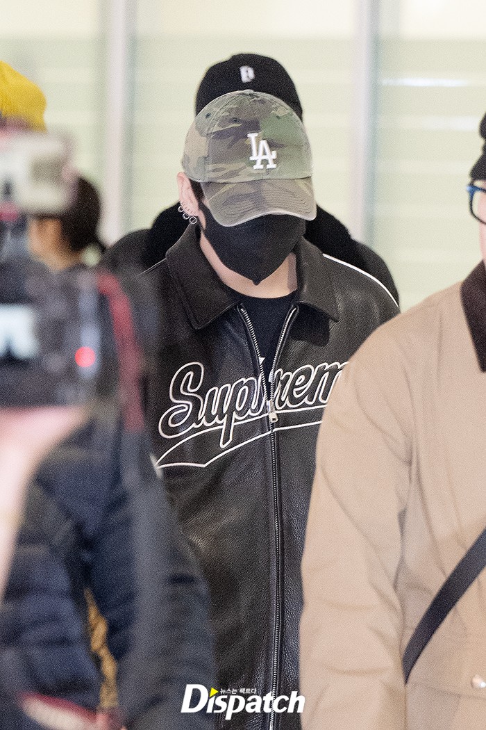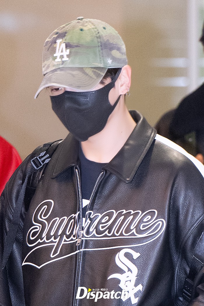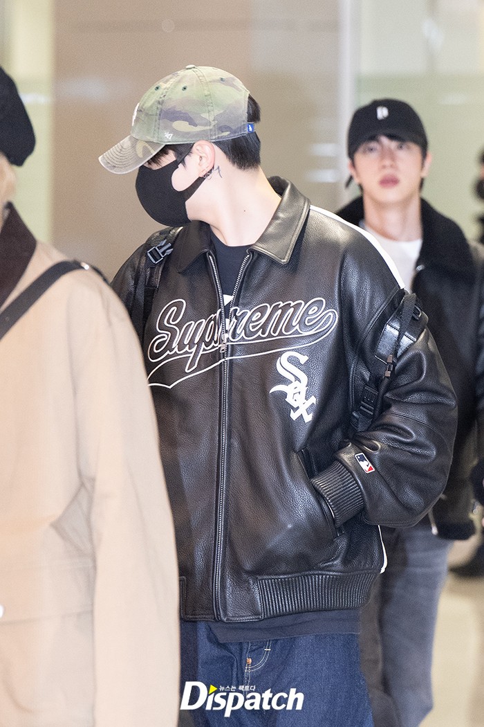 정국은 데님 팬츠에 레더 재킷으로 시크한 공항패션을 연출했다. 훈훈한 비주얼이 돋보였다.