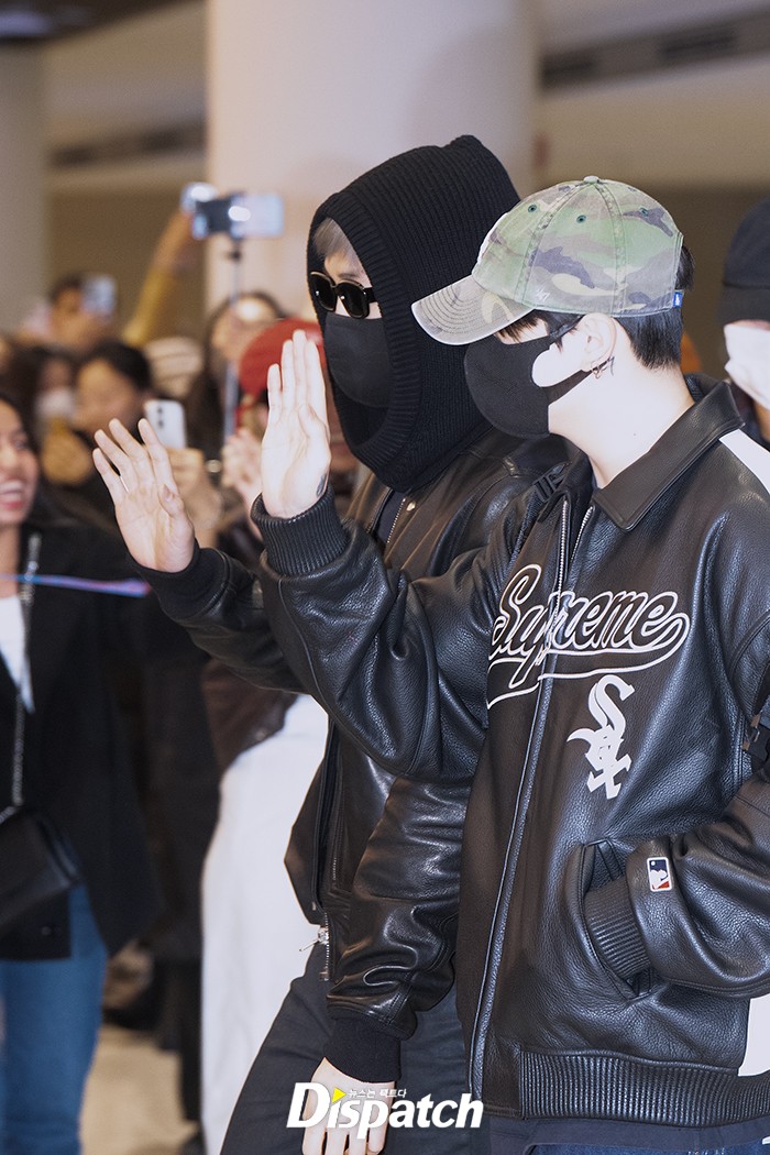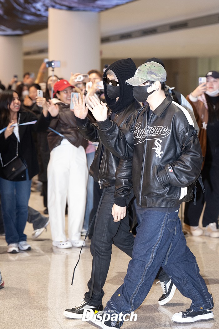 RM과 정국은 데님 팬츠에 레더 재킷으로 시크한 공항패션을 연출했다. 공항에 모인 팬들에게 인사를 하며 입국장을 빠져나갔다.