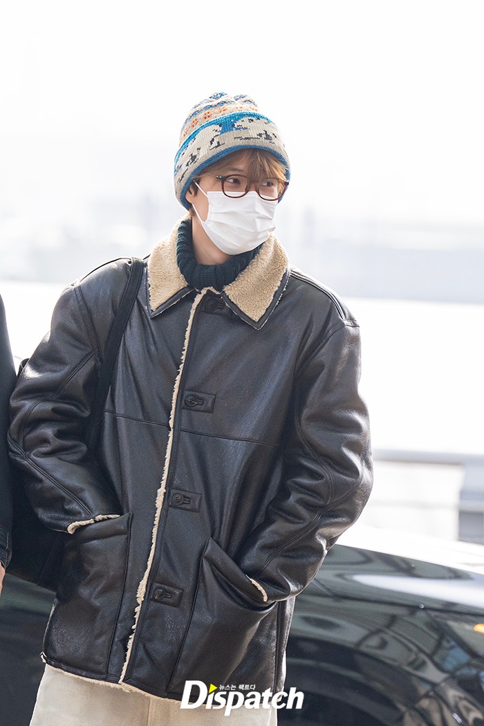 카이는 무스탕 재킷과 털모자로 패셔너블한 공항패션을 완성했다.