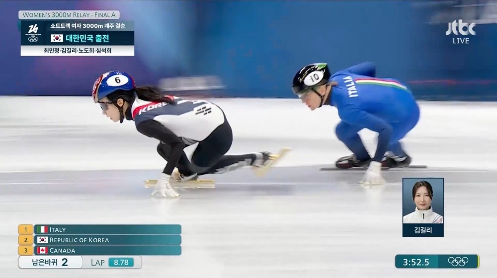 최민정은 2위로 올라섰다. 마지막 주자 김길리는 '람보르길리'답게 폭주했다. 이탈리아 폰타나를 스쳐 지나갔고, 인코스를 잘 지켜내며 결승선을 가장 먼저 통과했다.