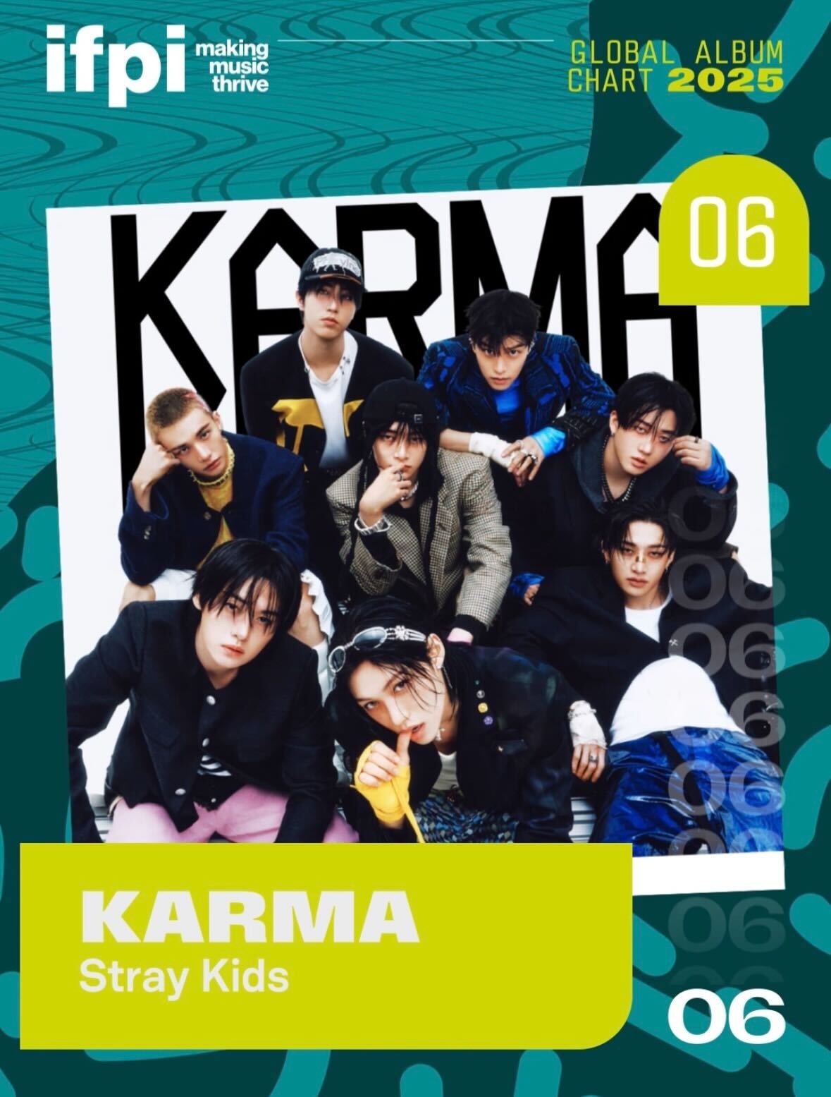 국제음반산업협회가 21일 공식 홈페이지와 SNS 채널에 2025 '글로벌 앨범 차트'를 발표했다. 스트레이 키즈가 정규 4집 '카르마'(KARMA)로 6위를 차지했다.