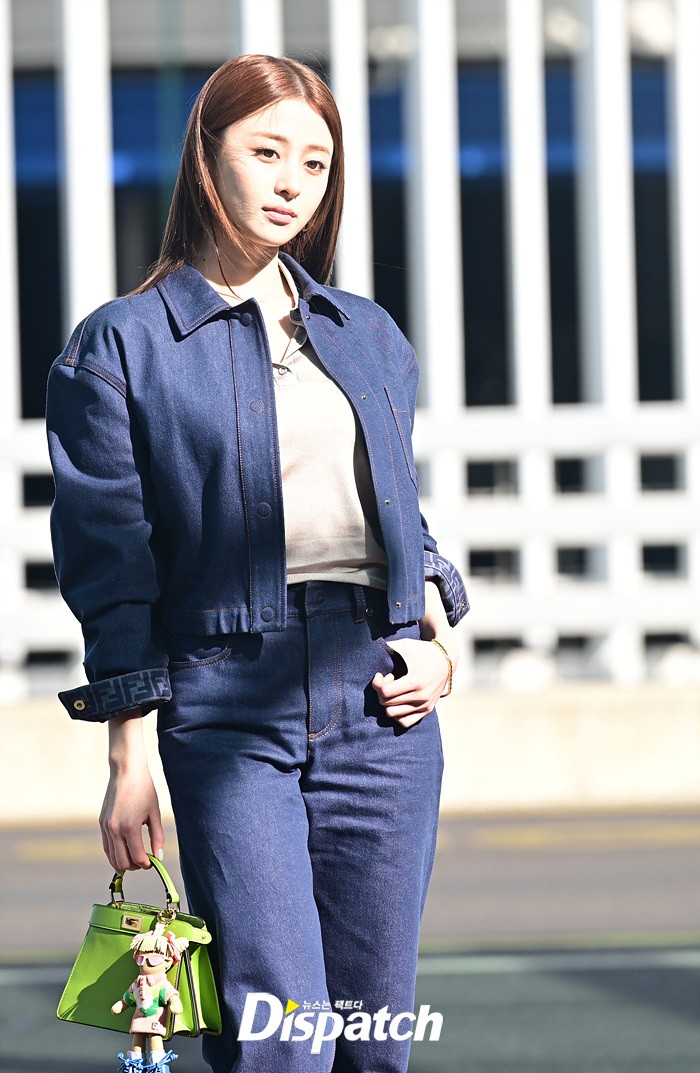 허윤진은 데님 소재의 의상으로 청청패션의 정석을 선보였다. 작은 얼굴과 완벽한 비율, 인형같은 이목구비가 돋보였다.