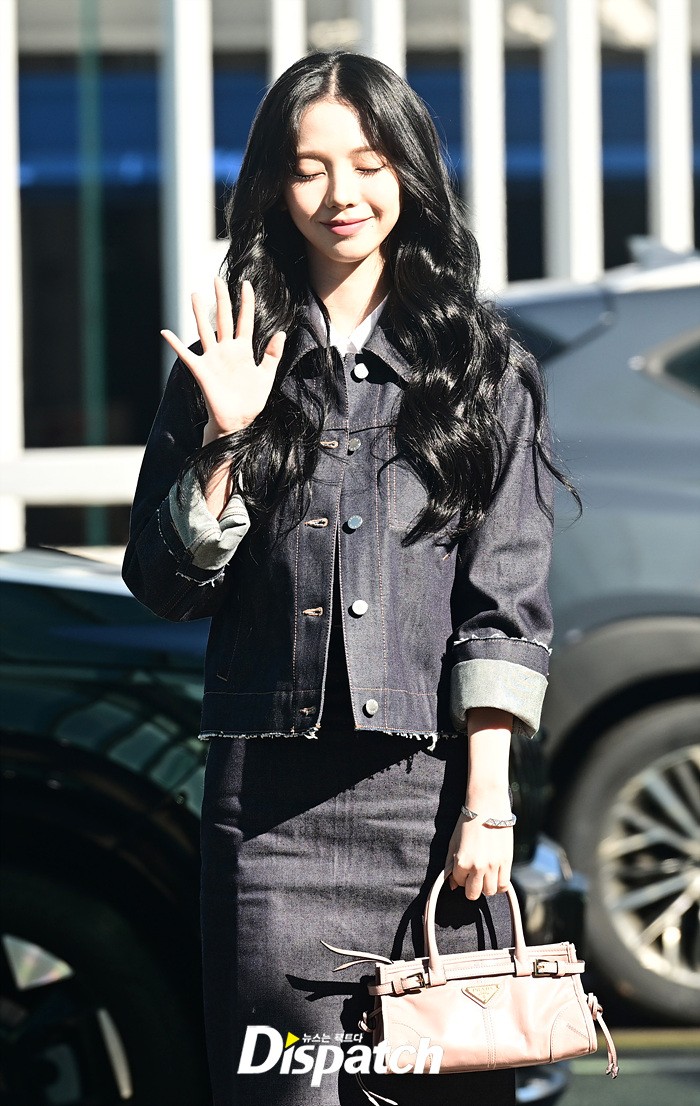 카리나는 데님 소재의 의상으로 세련된 공항패션을 완성했다. 눈부신 미모와 러블리한 미소도 돋보였다.