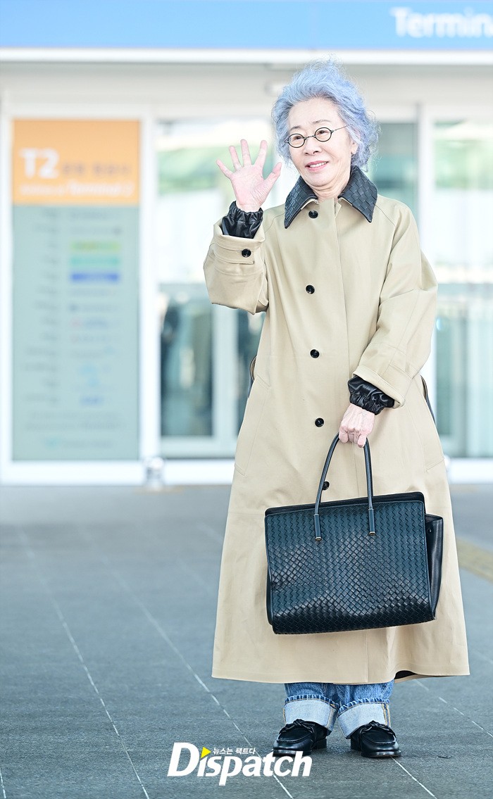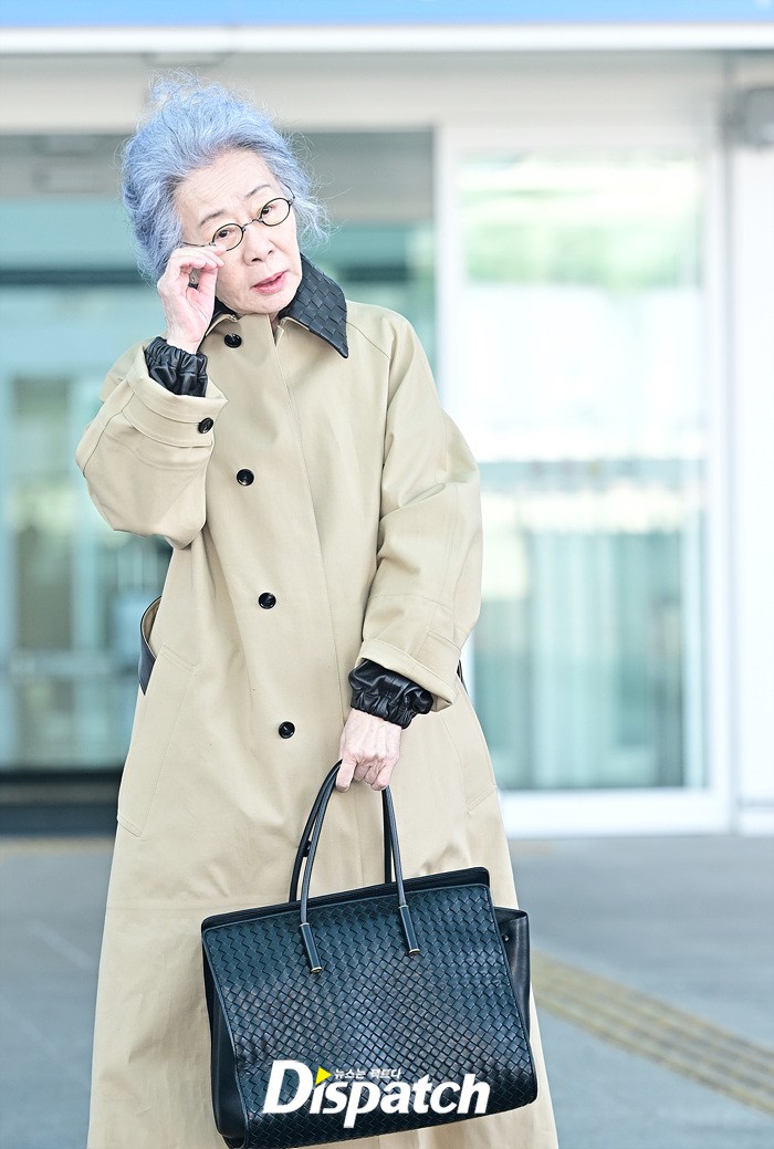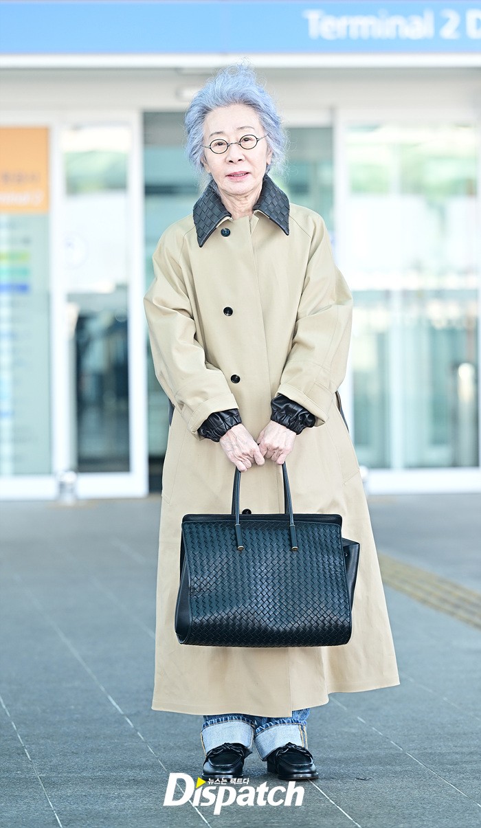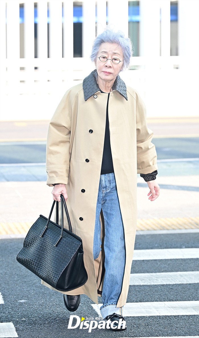 윤여정은 베이지 컬러의 트렌치 코트와 데님진, 빅백으로 남다른 공항패션을 완성했다. 세월을 거스른 자태로 시선을 모았다.