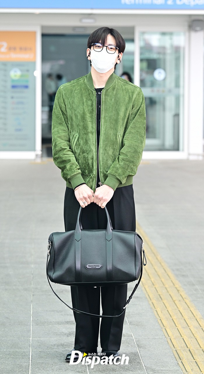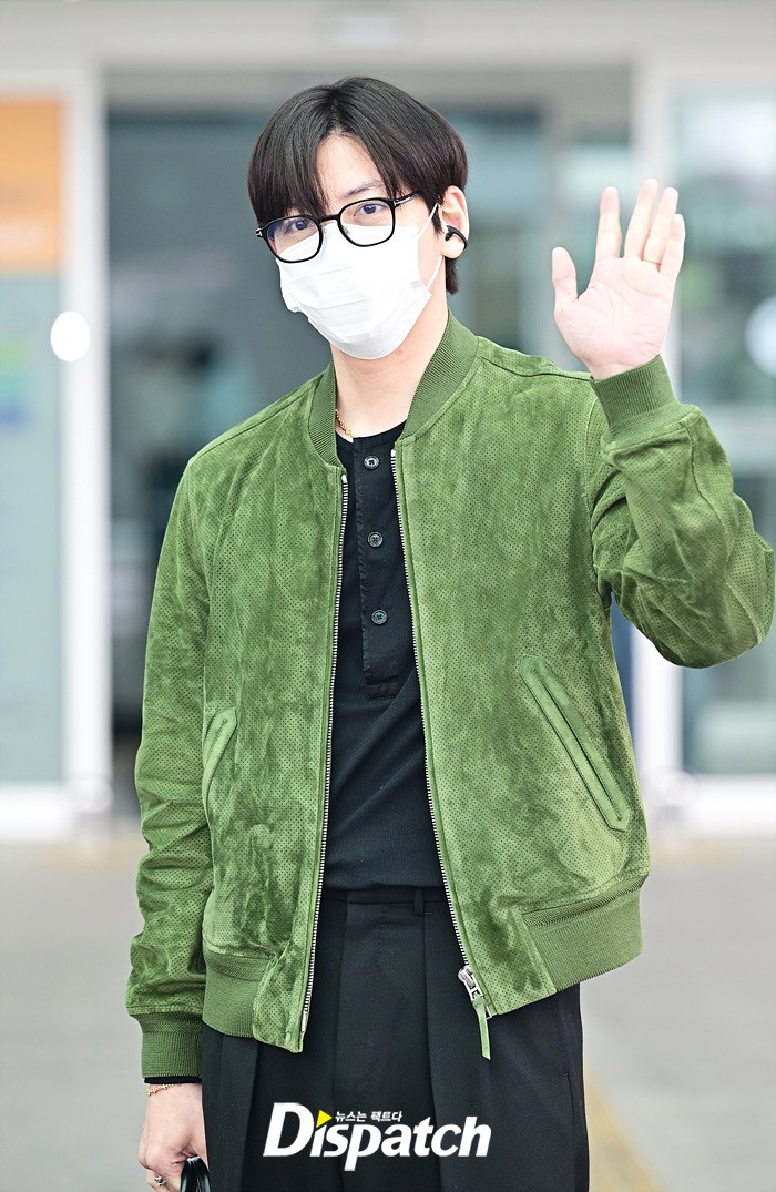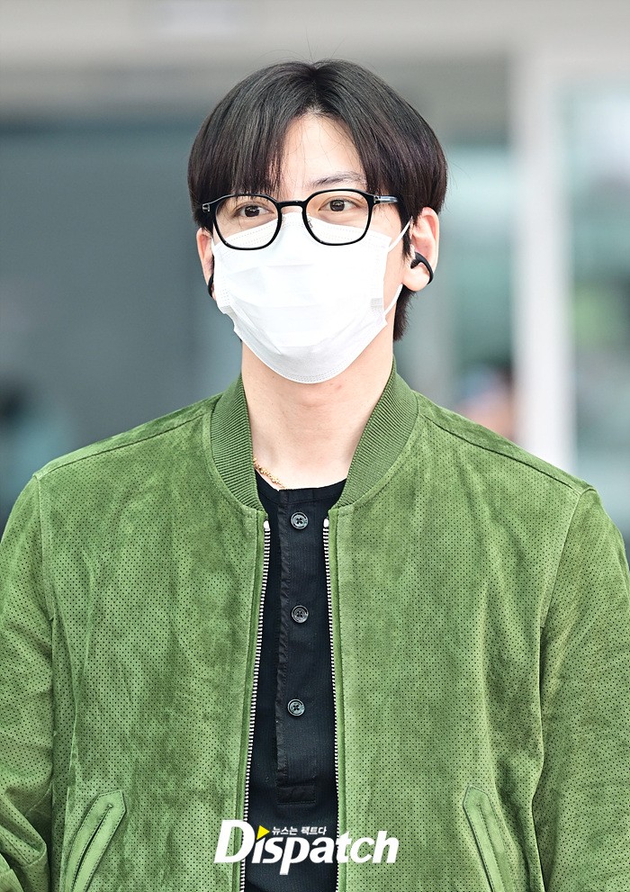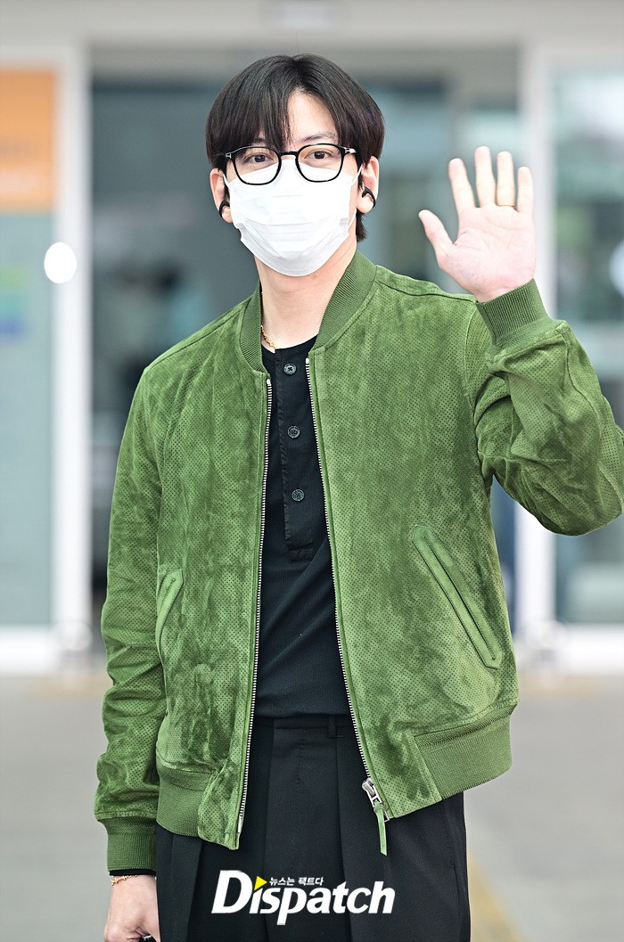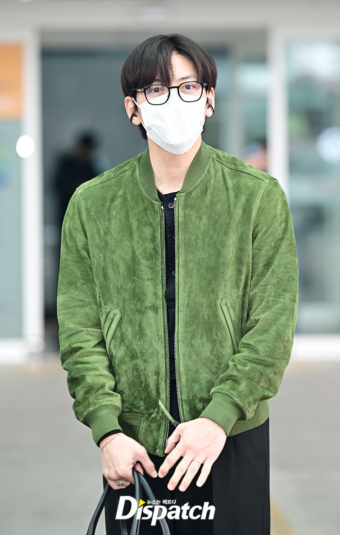지창욱은 그린 컬러의 재킷과 블랙 슬렉스로 세련된 공항패션을 연출했다. 마스크에도 훈훈한 비주얼이 돋보였다.