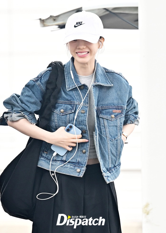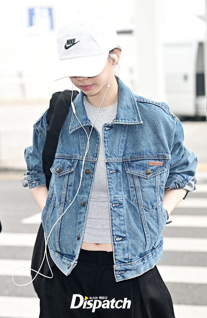 카리나는 화장기 없는 얼굴로 출국장을 나섰다. 데님 재킷과 블랙 와이드진으로 연출한 캐주얼한 공항패션도 돋보였다.
