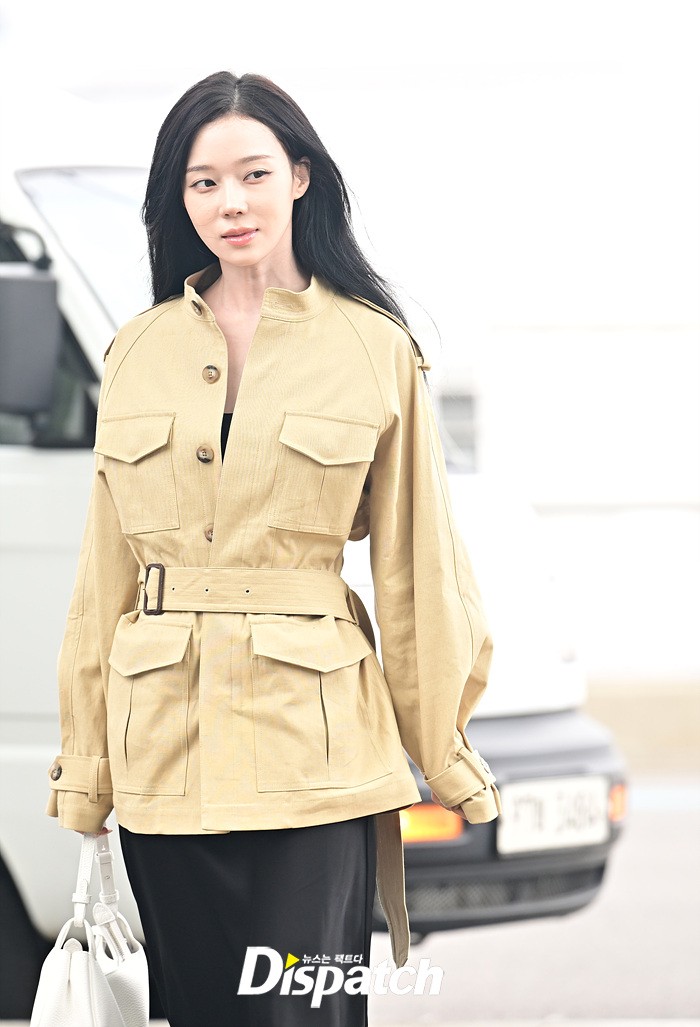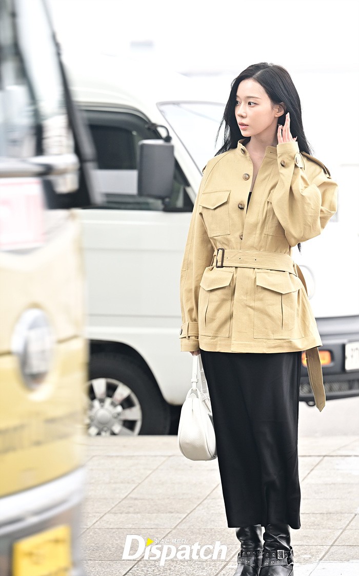윈터는 베이지 컬러의 하프코트와 블랙 스커트로 세련된 공항패션을 완성했다. 인형같은 이목구비와 러블리한 미소가 돋보였다.