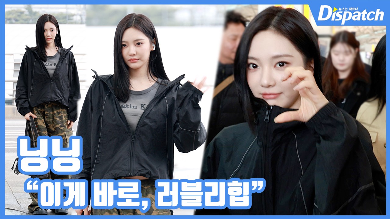 이날 닝닝은 레터링 그레이 티셔츠와 블랙 바람막이에 밀리터리 카고 팬츠를 매치해 힙한 공항패션을 선보였다. 손하트 포즈와 사랑스러운 미소로 러블리한 매력을 더했다.