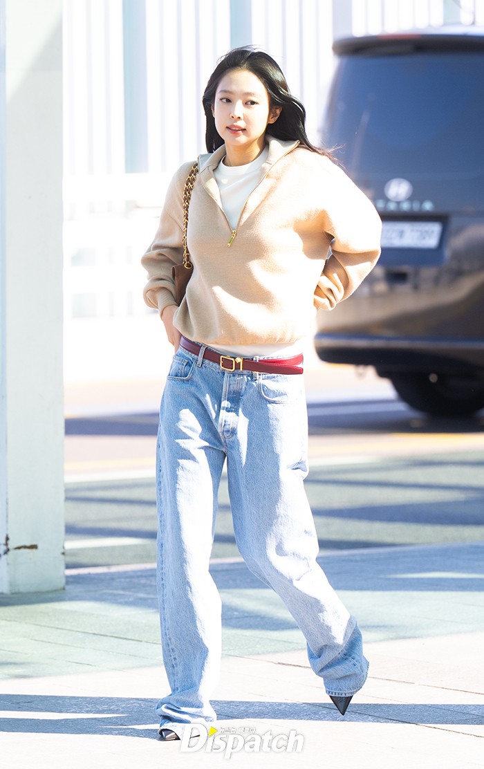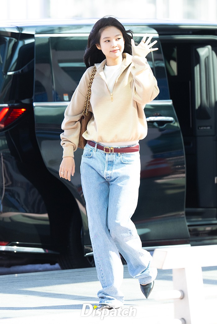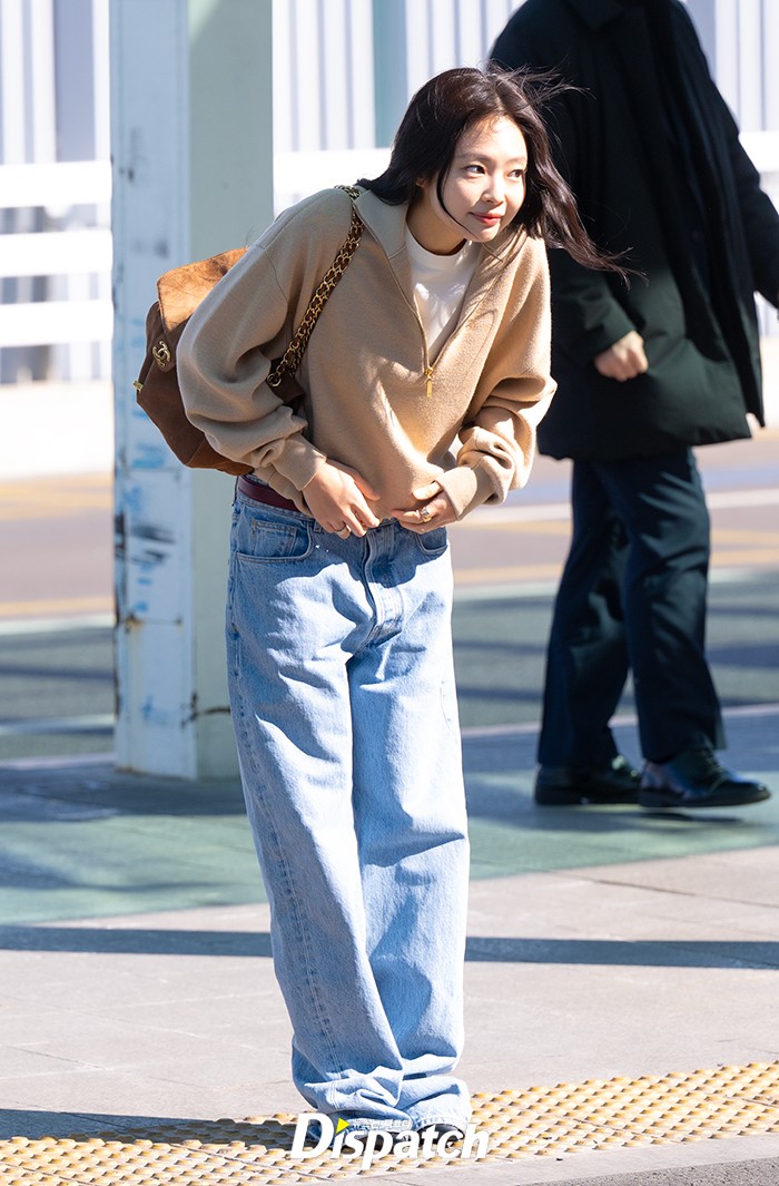 제니는 브라운 컬러 상의와 청바지로 공항패션을 선보였다. 밝은 미소로 시선을 사로잡았다.